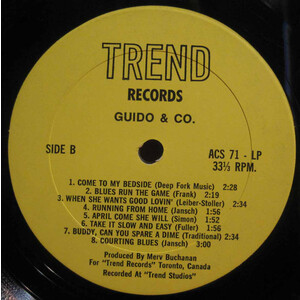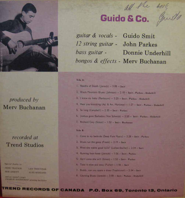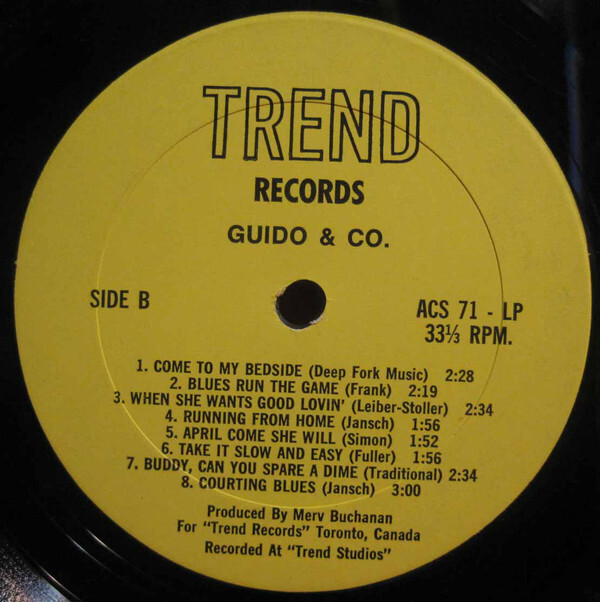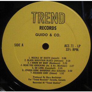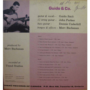 "Recording for Trend Records began before the label had a studio. Both Roy Kenner and The Uncertain were recorded, after hours, at The Modern Age Lounge, on Danforth Avenue, in Toronto. The first Trend recording studio was located below a grocery store, at the corner of Kingston Road and Warden Avenue, in Toronto. It was equipped with a 6-channel mixer, hand-made by Pete Traynor, with about 18 12AX7 tubes in it and an Ampex 601 mono tape recorder. There were no studio monitors in the closet-sized control room, only headphones. Of course everything sounded terrific, until it was played back on good speakers. The studio did mostly demo work and an album by Dutch immigrant Guido Smit, which sold 200 copies, mostly to his relatives back in Holland."