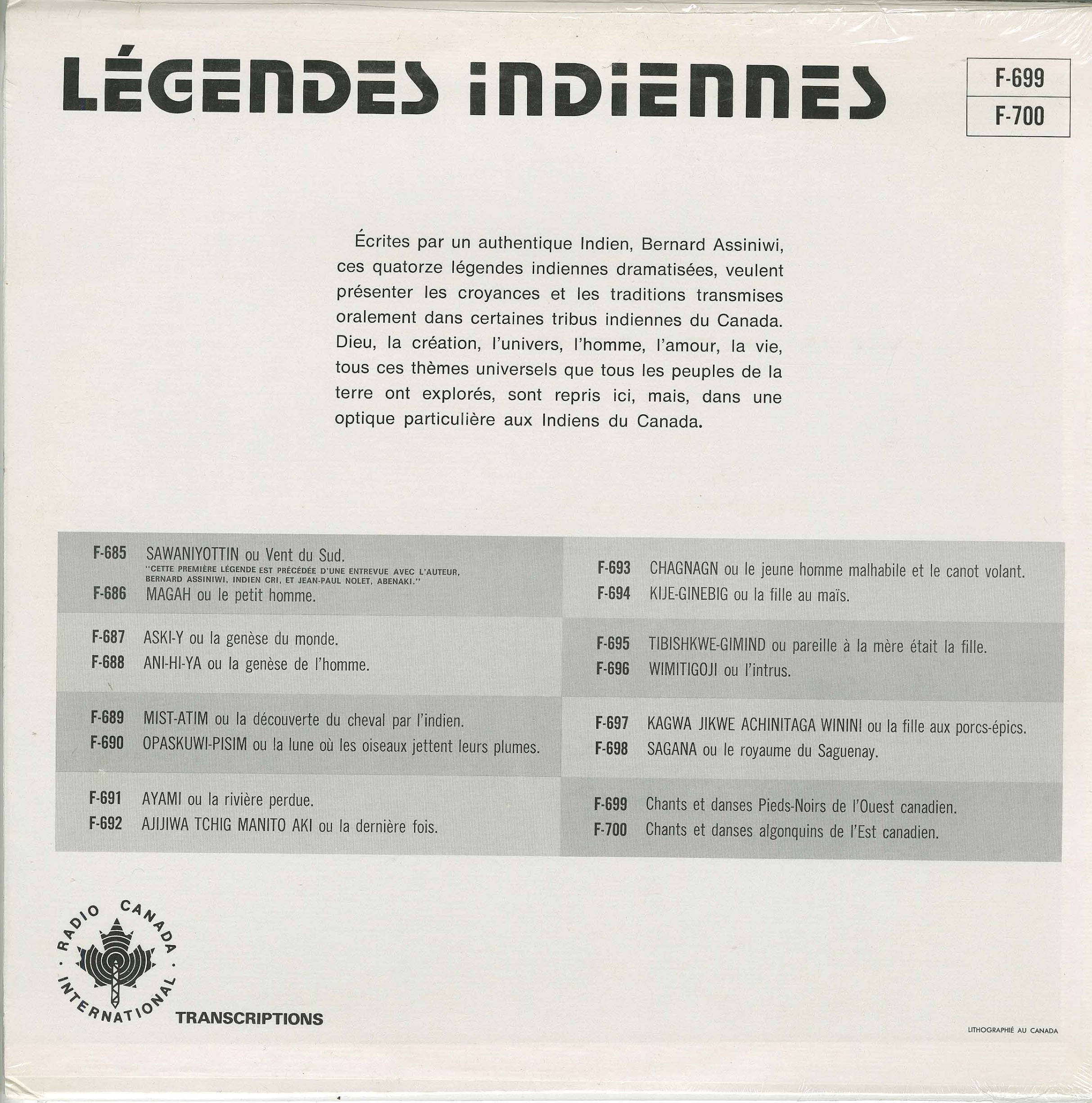 Final record of a record set on Radio Canada International F-685 to F-700. The other volumes in the series have tellings of legends of Canadian First Nations, dramatized by author Bernard Assiniwi. This is the only volume that has music.