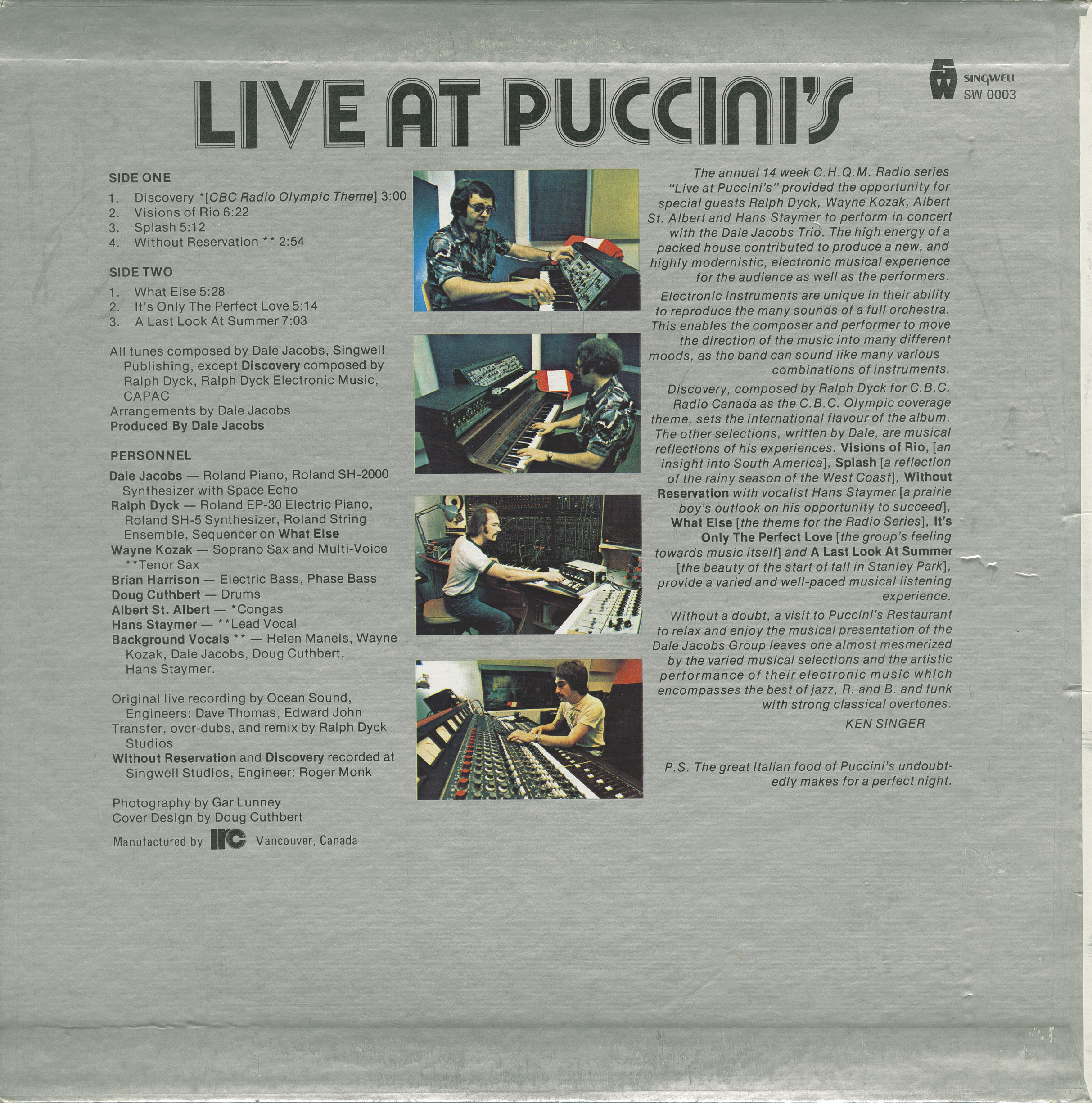 Jacobs gained significant attention with his 1977 live album Live at Puccini's, recorded during a 14-week CHQM Radio series at Puccini's Restaurant in Vancouver. The album featured collaborations with notable musicians such as electronics innovator Ralph Dyck, saxophonist Wayne Kozak, and vocalist Hans Staymer. Tracks like "Discovery," composed by Dyck for CBC Radio Canada's Olympic coverage, and Jacobs' own "Visions of Rio" showcased his skill in creating immersive, genre-defying compositions. ​