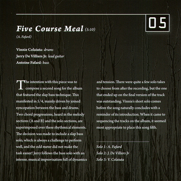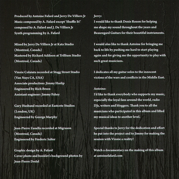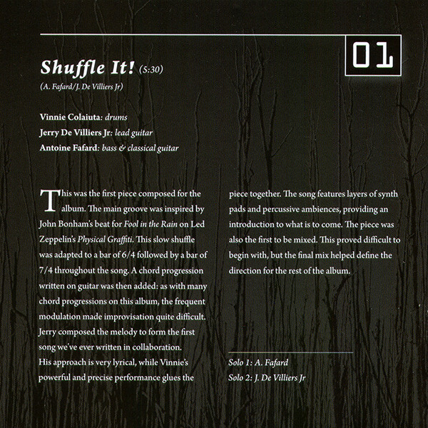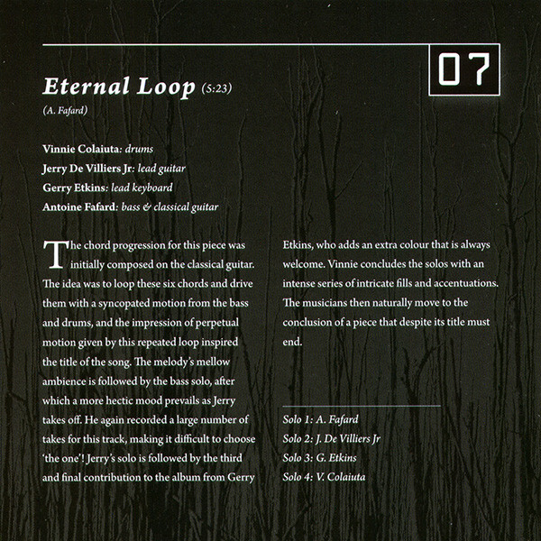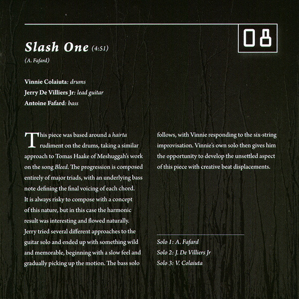 The music on Ad Perpetuum encompasses a broad spectrum of grooves and atmospheres. A conscious effort was made to offer a multitude of tempos, time signatures, structures and harmonic variations in order to showcase the virtuosity of the players. De Villiers Jr’s incredible guitar playing and tone brings a deep vitality to the music, while Colaiuta’s playing is simply flawless.