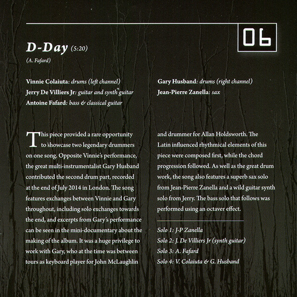 Additional guests include keyboardist Gerry Etkins on three songs and saxophonist Jean-Pierre Zanella on another three tracks. Another significant contribution comes from Gary Husband, who features on the intense drum duet D-Day.
