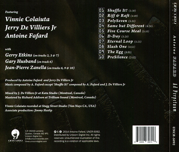 Ad Perpetuum, released in October 2014, is bass player Antoine Fafard’s third album of new work, and features Vinnie Colaiuta and Jerry De Villiers Jr throughout the collection. Colaiuta’s extraordinary performances show why he is a true drum legend, while De Villiers Jr’s beautiful tone and inspired guitar work will prove irresistible to all fans of jazz fusion.