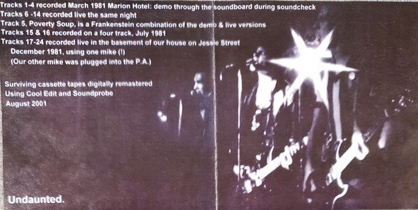 Tracks 17 - 24: recorded live in the basement of our house on Jesse Street, December 1981.