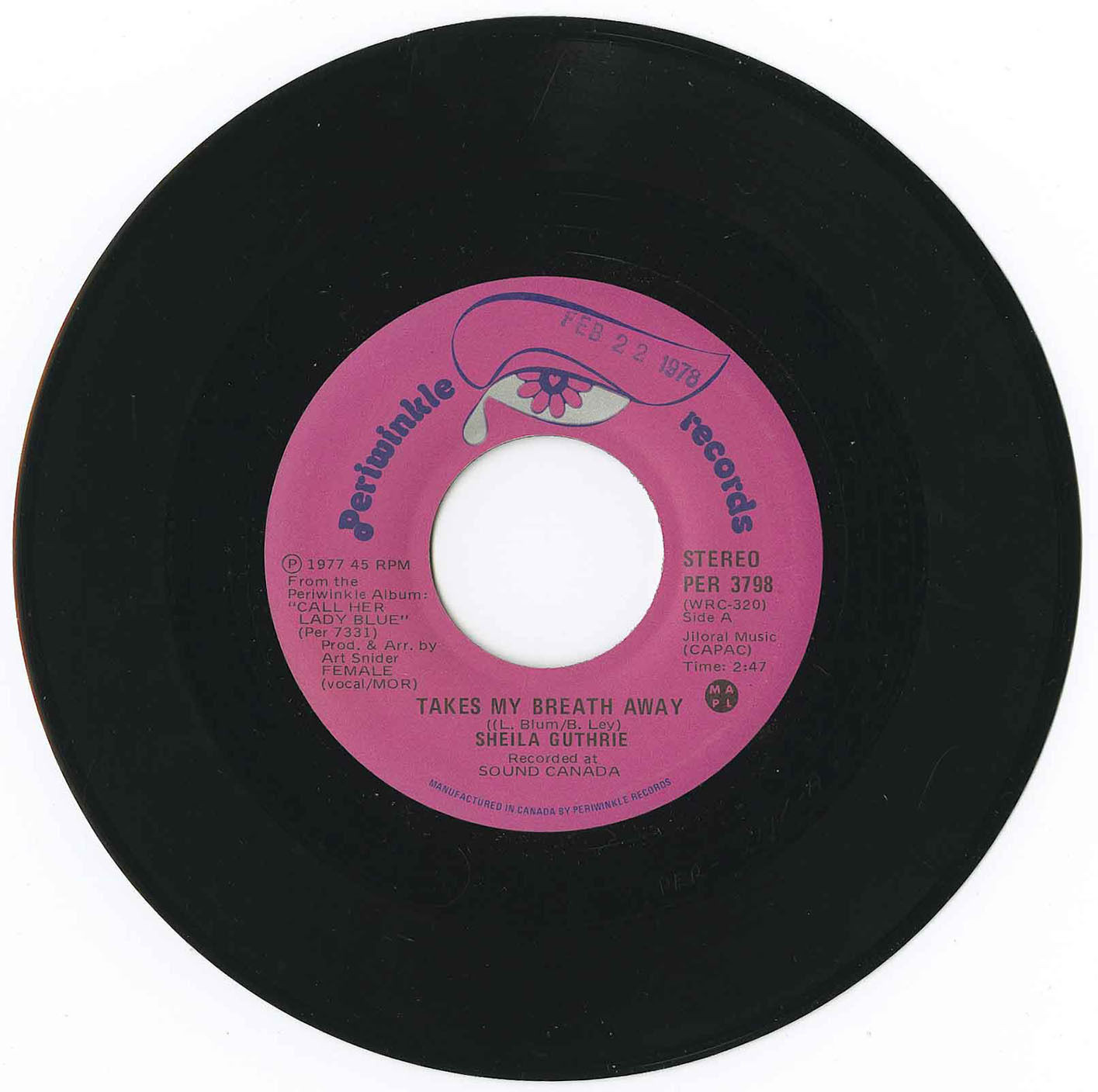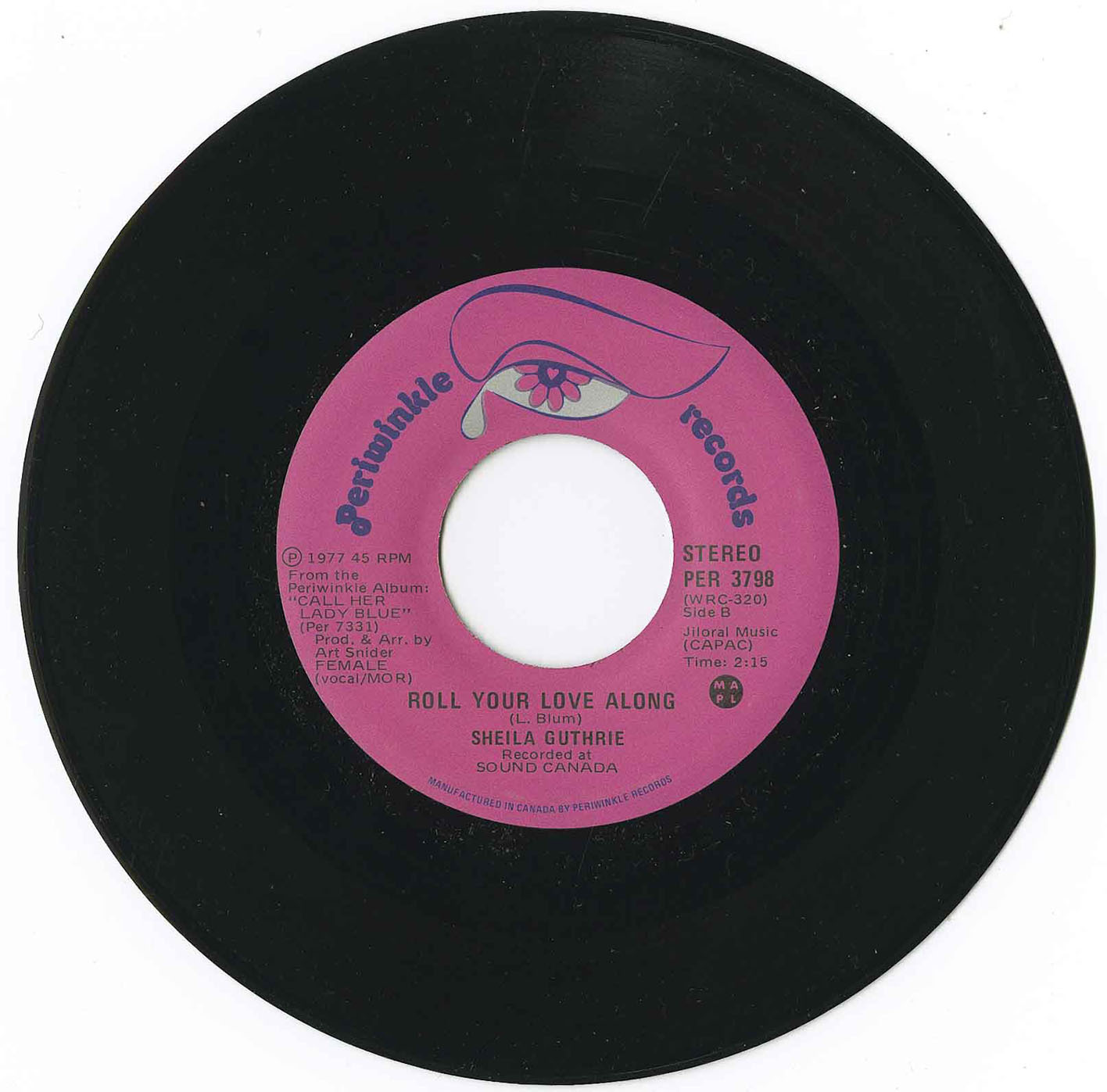 A decade later Guthrie returned with a second full-length, Call Her Lady Blue (Periwinkle PER-7331, 1978), again produced by Art Snider. Recorded at Sound Canada with a seasoned cast of Toronto musicians including Doug Riley, Brian Leonard, and Dave Classic, the album featured contemporary material such as Morris Albert’s “Feelings,” Gerry Goffin and Mike Masser’s “Theme from Mahogany,” Bobby Hebb’s “Sunny,” and a number of songs by Canadian writer Len Blum. The singles “Takes My Breath Away” and “Roll Your Love Along” received airplay, with RPM noting their release.