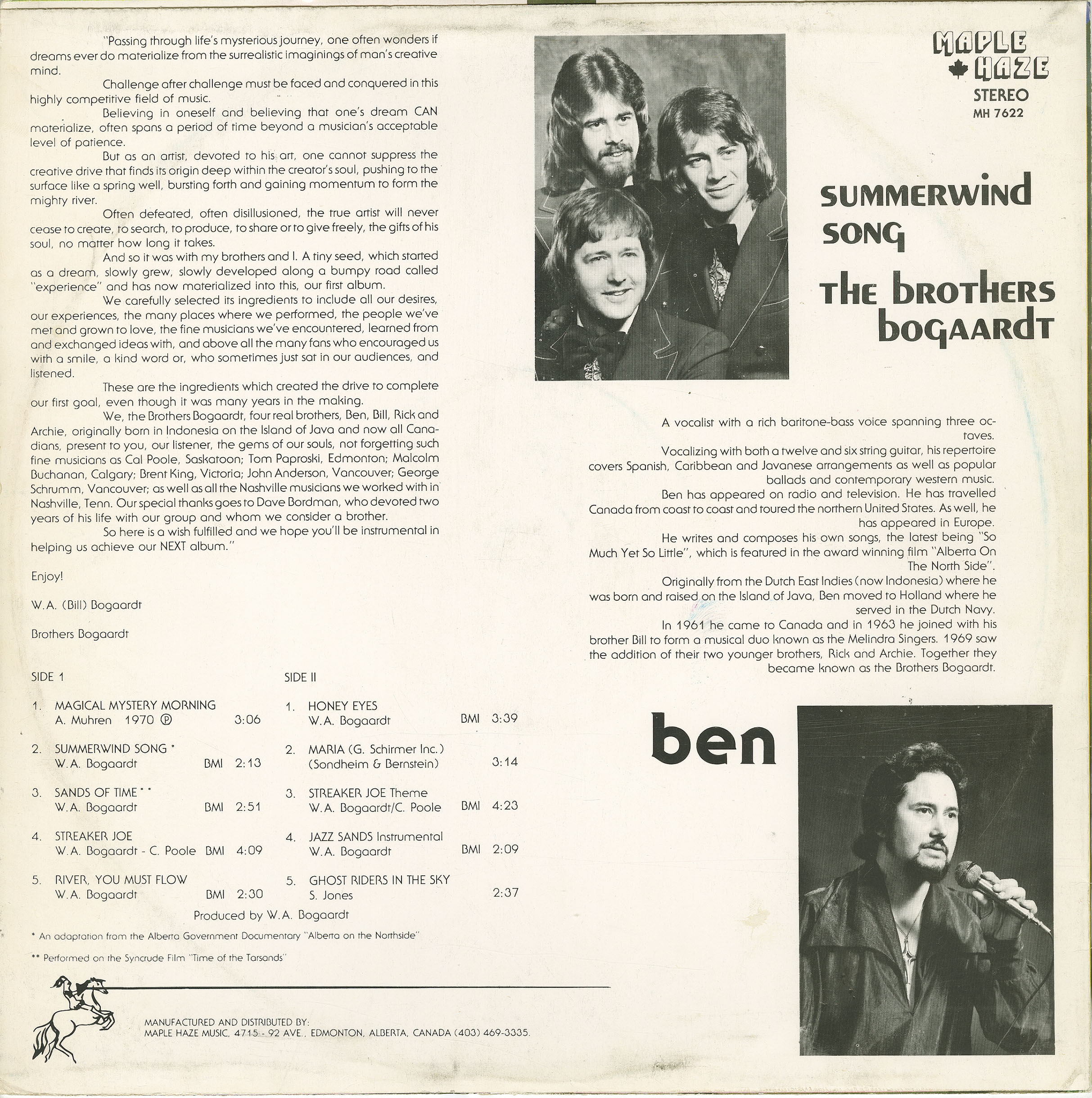 Their songs were featured in a documentary film which won the Gold Camera award in Chicago, Illinois in the 70's. Bill also received an award for his musical compositions for the Syncrude film "Time of the Tarsands", with Canadian actor, Gordon Pinsent. This album features on of those tracks that appeared in the documentary: 'Sands of Time'. 'Summerwind Song' is an adaption from the Alberta Government Documentary "Alberta On The Northside".