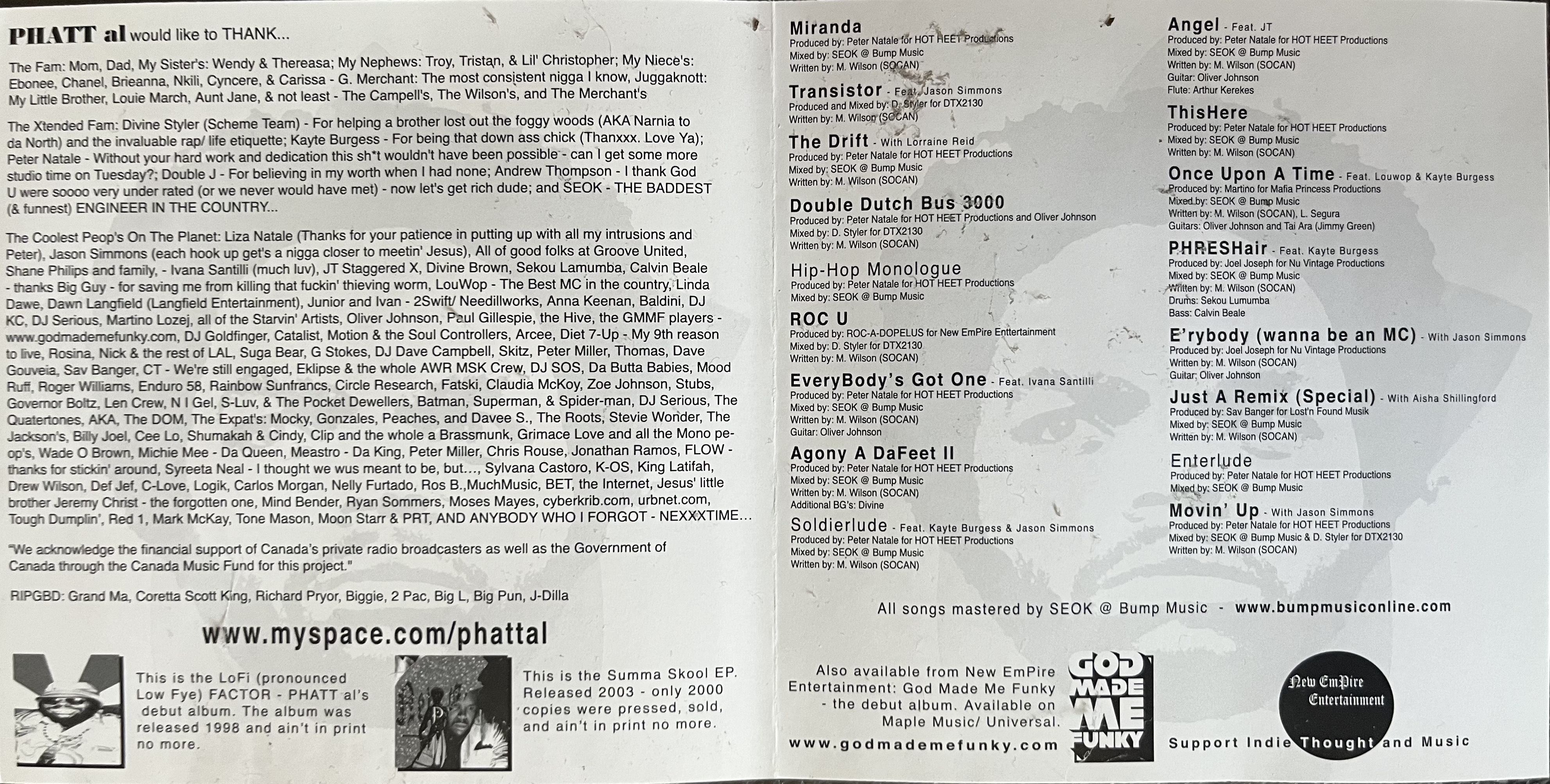A longtime Toronto hip-hop fixture and MC collaborator with God Made Me Funky and The Quartertones, PHATT Al returns with a third release that takes advantage of his funk connections, with an emphasis on Clinton-style breakdowns. Transistor doesn't get too heavy or psychedelic, but bears the heady influence of Divine Styler -- abstract funkiness, unorthodox choruses, random voice distortion -- who lends his production skills to the leadoff title track. Al's veteran status is reflected in this fairly mature record; his greatest assets are his smooth flow, consistent sound and intelligent take on potentially tired subject matter (relationships, the problem with hip-hop). Though occasionally too laid-back, PHATT Al's got a sound that could rock a jazz festival or an open-mic night with equal zest.