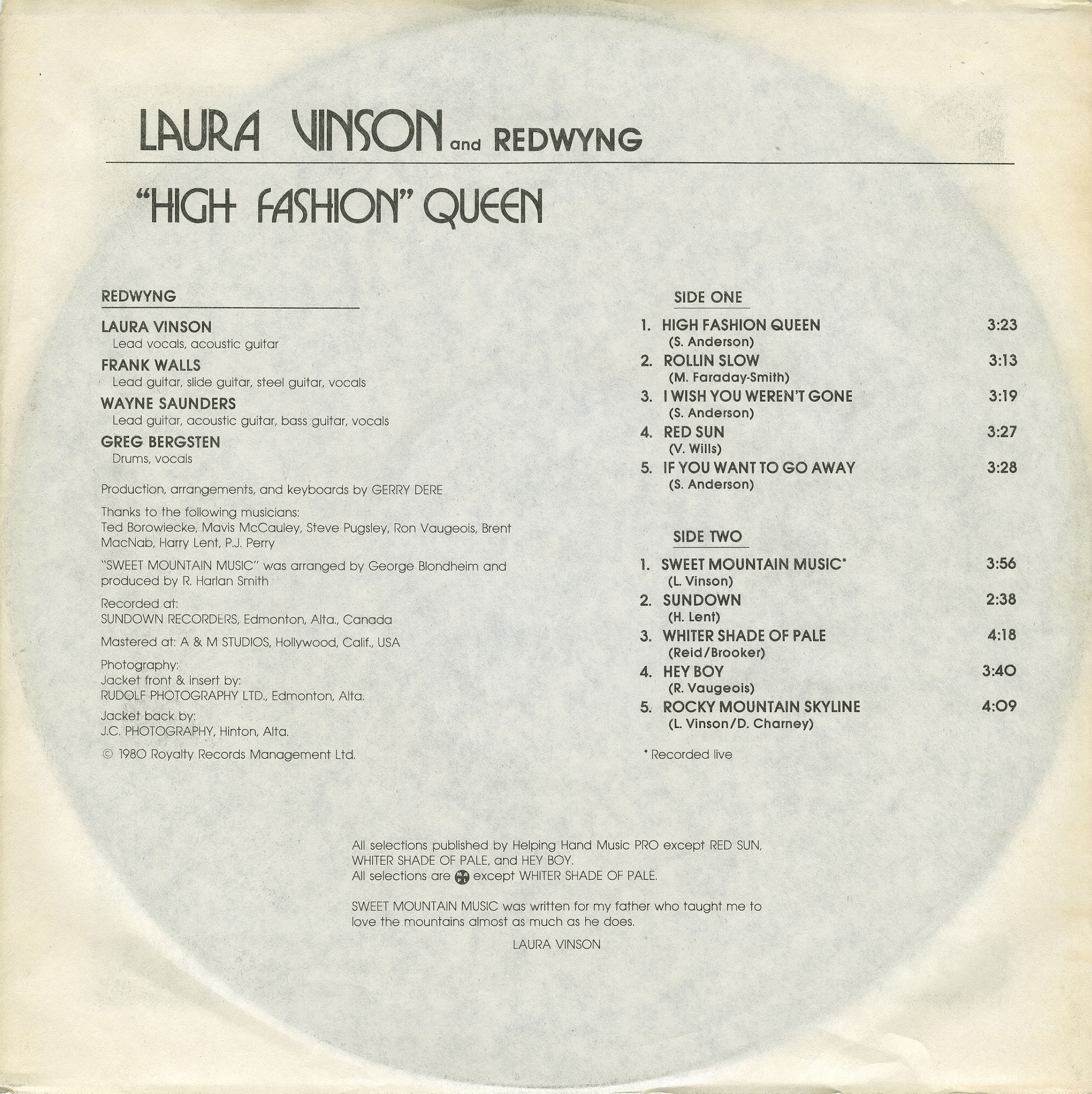 Recorded at Sundown Recorders, Edmonton, Alberta