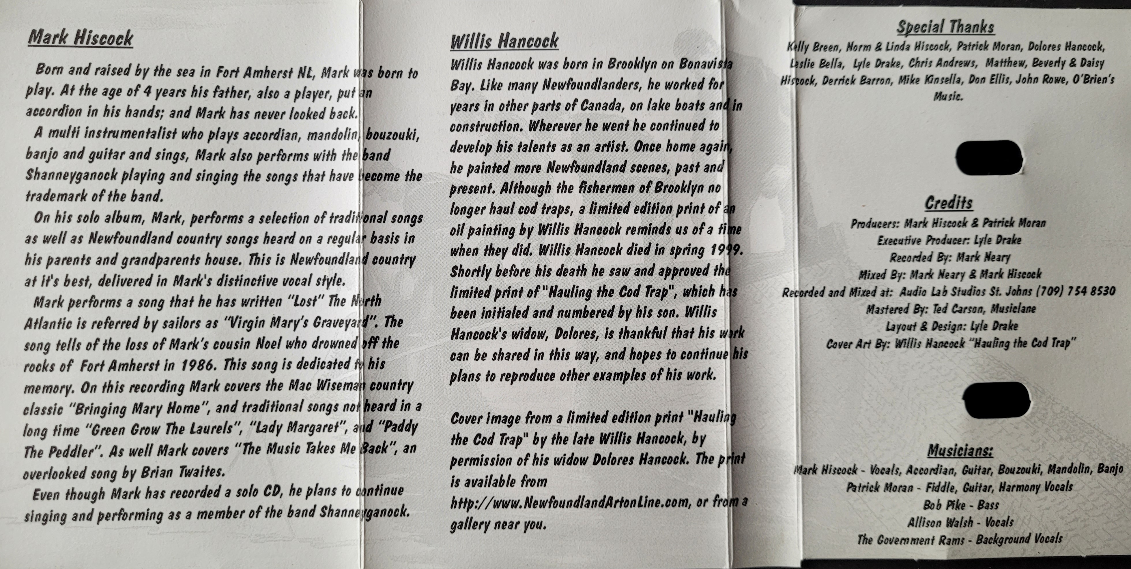 Mark Hiscock: vocals, accordion, guitar, bouzouki, mandolin, banjo