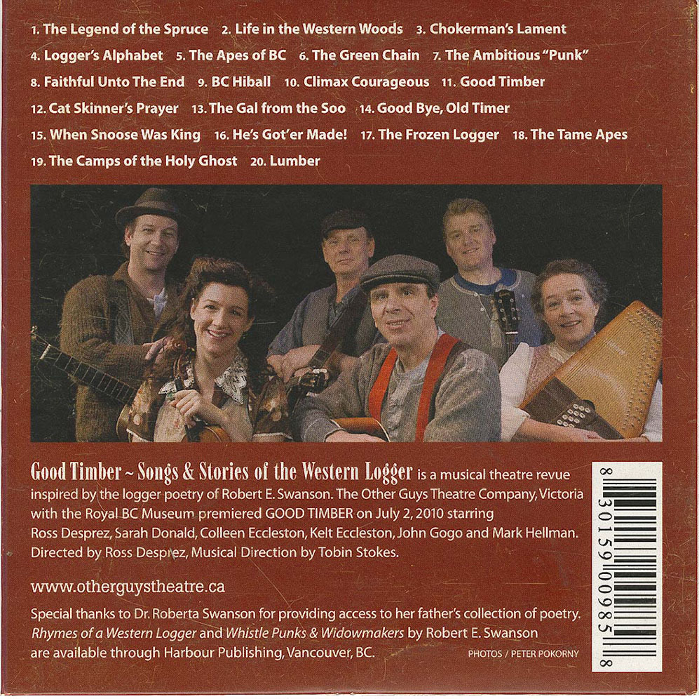 The company focus for 2008/09 was the development of the new multi-media musical revue Good Timber – Songs and Stories of the Western Logger. This work again reunited the team of Desprez and Stokes as lead creators collaborating with some of BC’s finest actor/musicians. The show premiered on July 2, 2010 at the Royal BC Museum. The response to the piece was outstanding and it has toured BC during 2011, 2012 and planning is underway for more in 2013.