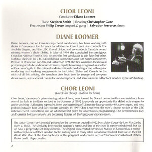 Chor Leoni gave its first Remembrance Day concert in 1993, remembering and honouring those who have fought and died in defence of our country. The concert struck a receptive chord with Vancouver audiences and it quickly became established as an annual fixture in the Lower Mainland’s choral season. Released in June 1995, this CD presents material from Chor Leoni’s first two Remembrance Day concerts, songs that have become favourites of both the choir and audiences alike.