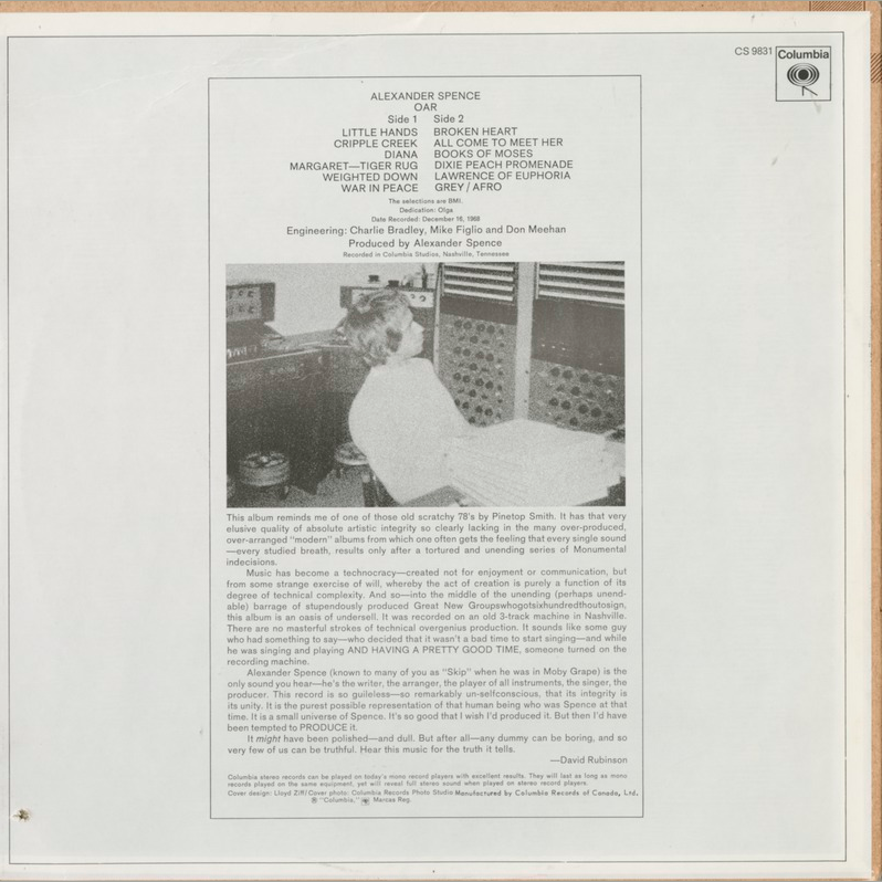 No one except psychedelic Renaissance man Alexander "Skip" Spence could have created an album such as Oar. Alternately heralded as a "soundtrack to schizophrenia" and a "visionary solo effort," Oar became delegated to cut-out and bargain bins shortly after its release in the spring of 1969. However, those who did hear it were instantly drawn into Spence's inimitable sonic surrealism. As his illustrious past in the Jefferson Airplane, Quicksilver Messenger Service, and Moby Grape would suggest, this album is a warped blend of acid folk and far-out psychedelic rock. While these original compositions do draw heavily from those genres, each song has the individuality of a fingerprint, and Spence performed and produced every sound on the album himself at Columbia studios in Nashville in the space of less than two weeks. This burst of creativity was directly preceded by a six-month incarceration in New York City's Bellevue Hospital after chopping down a door at the Albert Hotel en route to do the same to fellow Moby Grape members Jerry Miller's and Don Stevenson's doors. A common motif to this album is the presence of saints and demons. Even the straightforward narratives such as the love ballads "Broken Heart" and "Cripple Creek" -- which feature vocal treatments reminiscent of folkie Fred Neil -- are bathed in unusual chord sequences and lyrical double-entendre. The majority of the sounds on this long player remain teetering near the precipice of sanity. Primary examples include "War in Peace," the epic "Grey/Afro," and the sound effect-laden "Books of Moses." Comparisons have been made to Syd Barrett, John Lennon, and Frank Zappa -- the latter especially for the intense sonic collage techniques displayed on albums such as Lumpy Gravy and Civilization Phase III.
