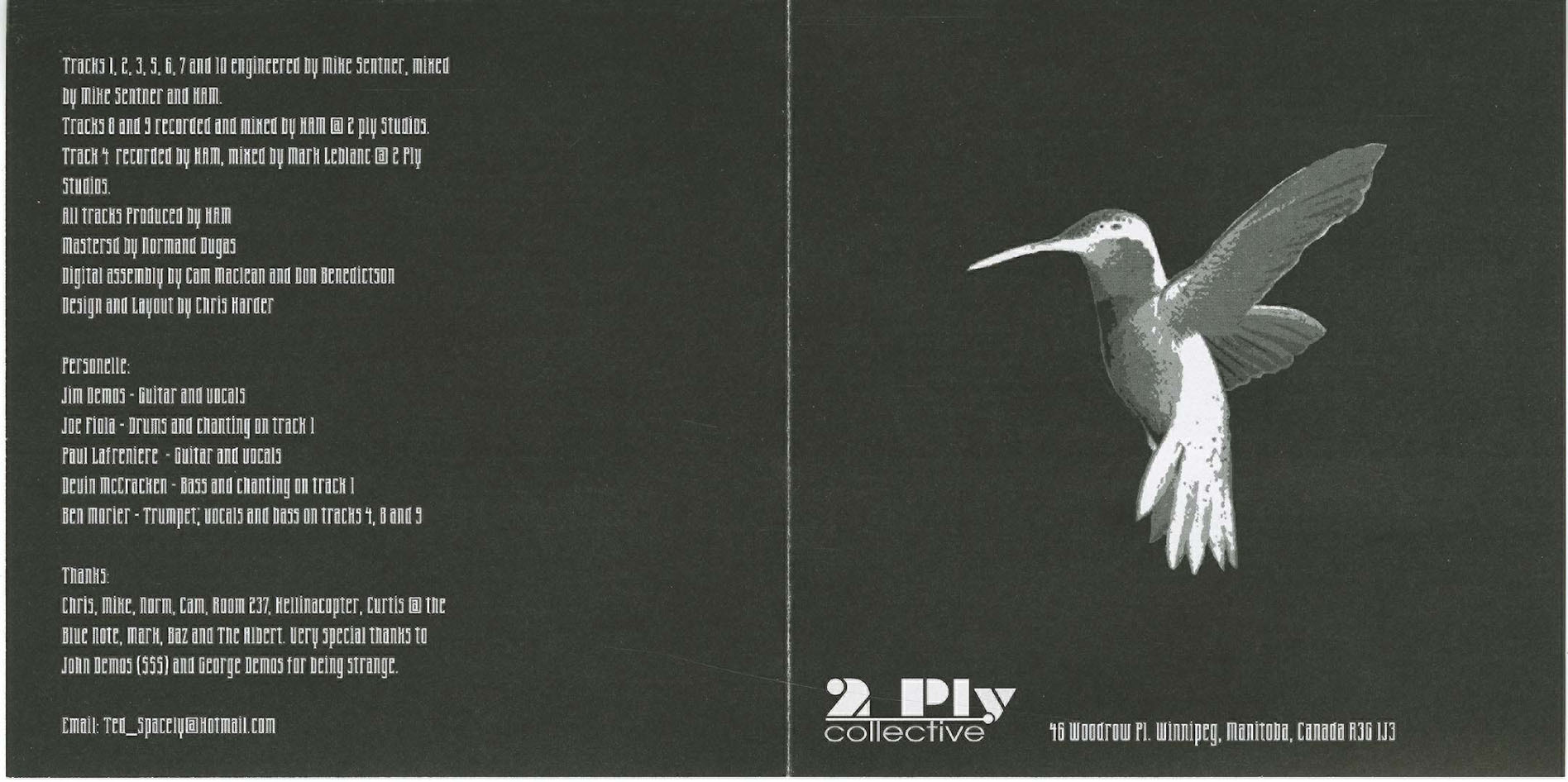 Tracks 3, 7, 10 (hidden Track) recorded at the Franco Manitoban Cultural Centre on a fostex 8 track reel to reel tape machine.