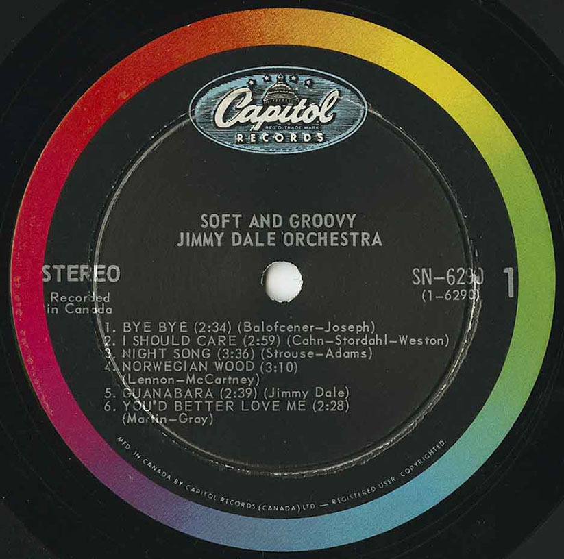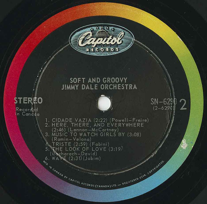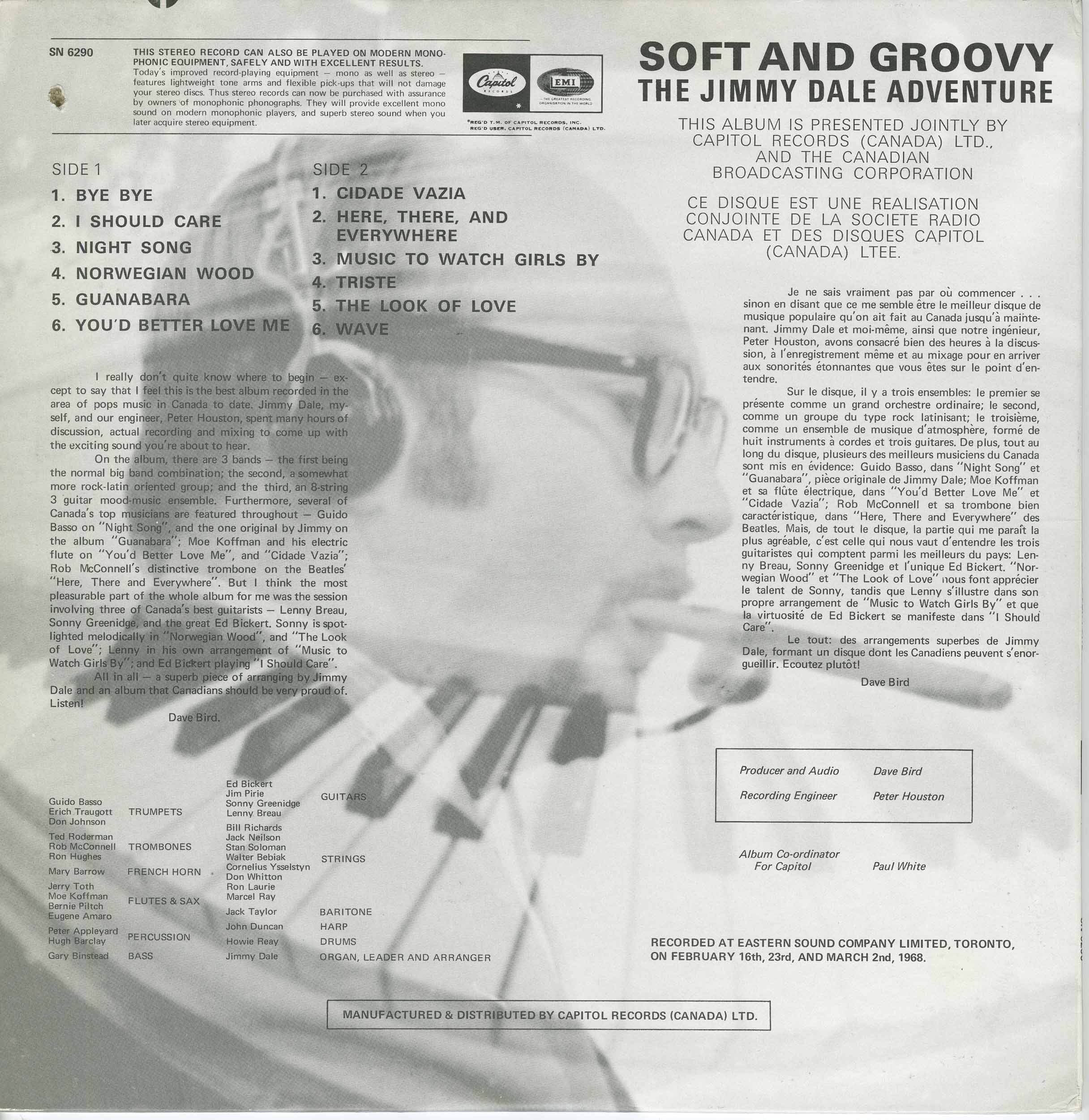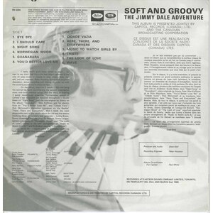Groovy Canadian-only Capitol/CBC co-production instrumental LP featuring the talents of Guido Basso (trumpet), Ted Roderman, Rob McConnell (trombone), Jerry Toth, Moe Koffman, Eugene Amaro (flute & sax), Peter Appleyard (percussion), Ed Bickert, Jim Pirie, Sonny Greenidge, Lenny Breau (guitar), and Jimmy Dale (organ, leader, and arranger). Killer LP end-to-end with strong Brazilian and Beatles selections… Wow, great version of Milton Banana's "Cidade Vazia", you never see this! Great jazz bossa big band!