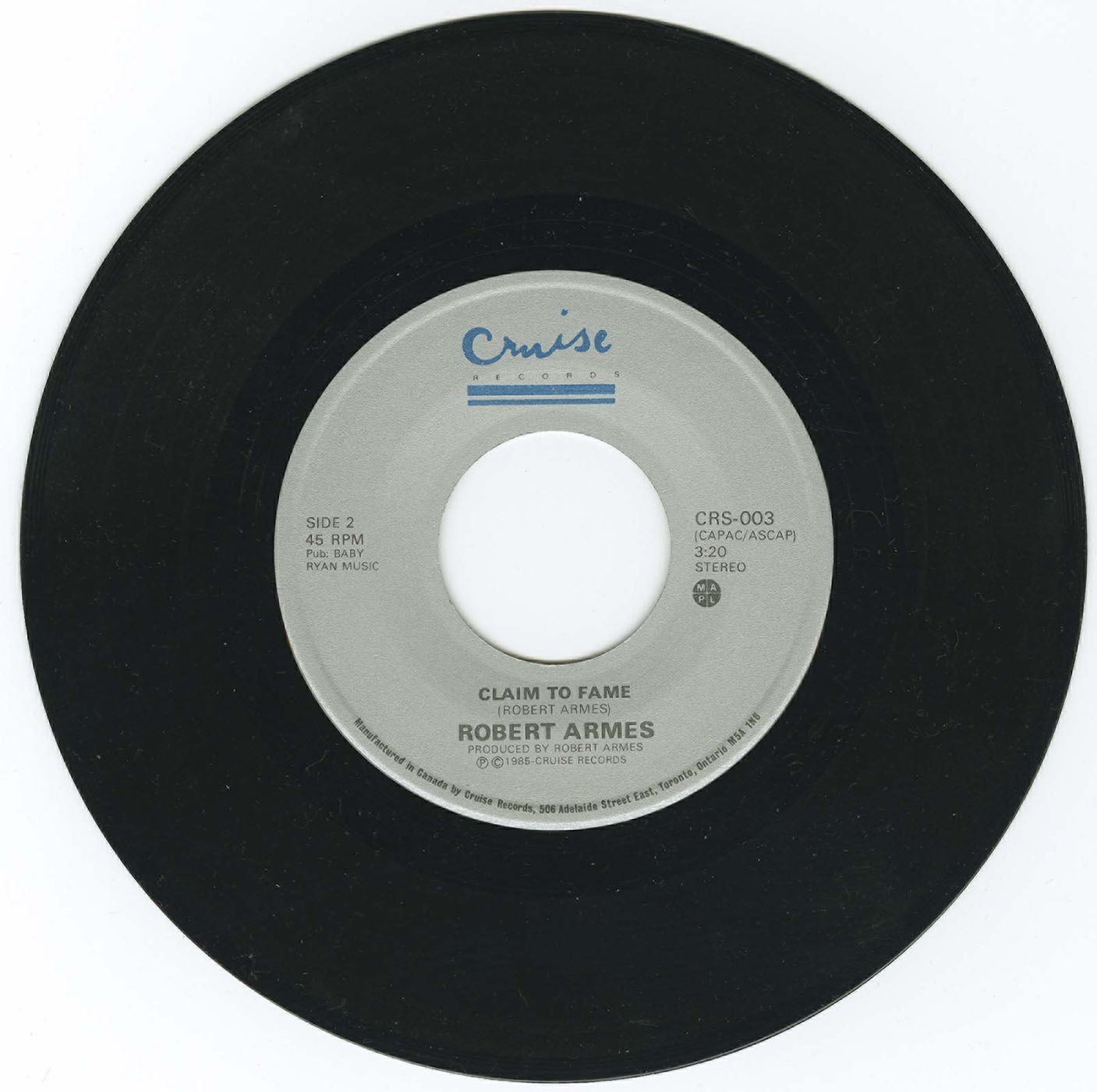 In 1984 Armes launched Cruise Records with a small team of Toronto studio musicians, releasing the label’s inaugural single Claim to Fame b/w Goodbye to Love (CRS-001). The recording featured Pepe Francis on guitar, Mark Hukezalie on Fender Rhodes, Moe Koffman on alto sax, Tom Szczesniak on bass, Barry Keane on drums, and percussion by Dick Smith, with background vocals by Shawn Jackson, Colina Phillips, and John Rutledge. It was produced by Armes and engineered by Kevin Doyle at Sounds Interchange, Studio 1. A follow-up single, Lessons in Love b/w Claim to Fame (CRS-003, 1985), featured the same core team with Tim Tickner on synthesizer programming and vibes. Kevin Doyle’s engineering on the session won him the 1985 Juno Award for Recording Engineer of the Year.