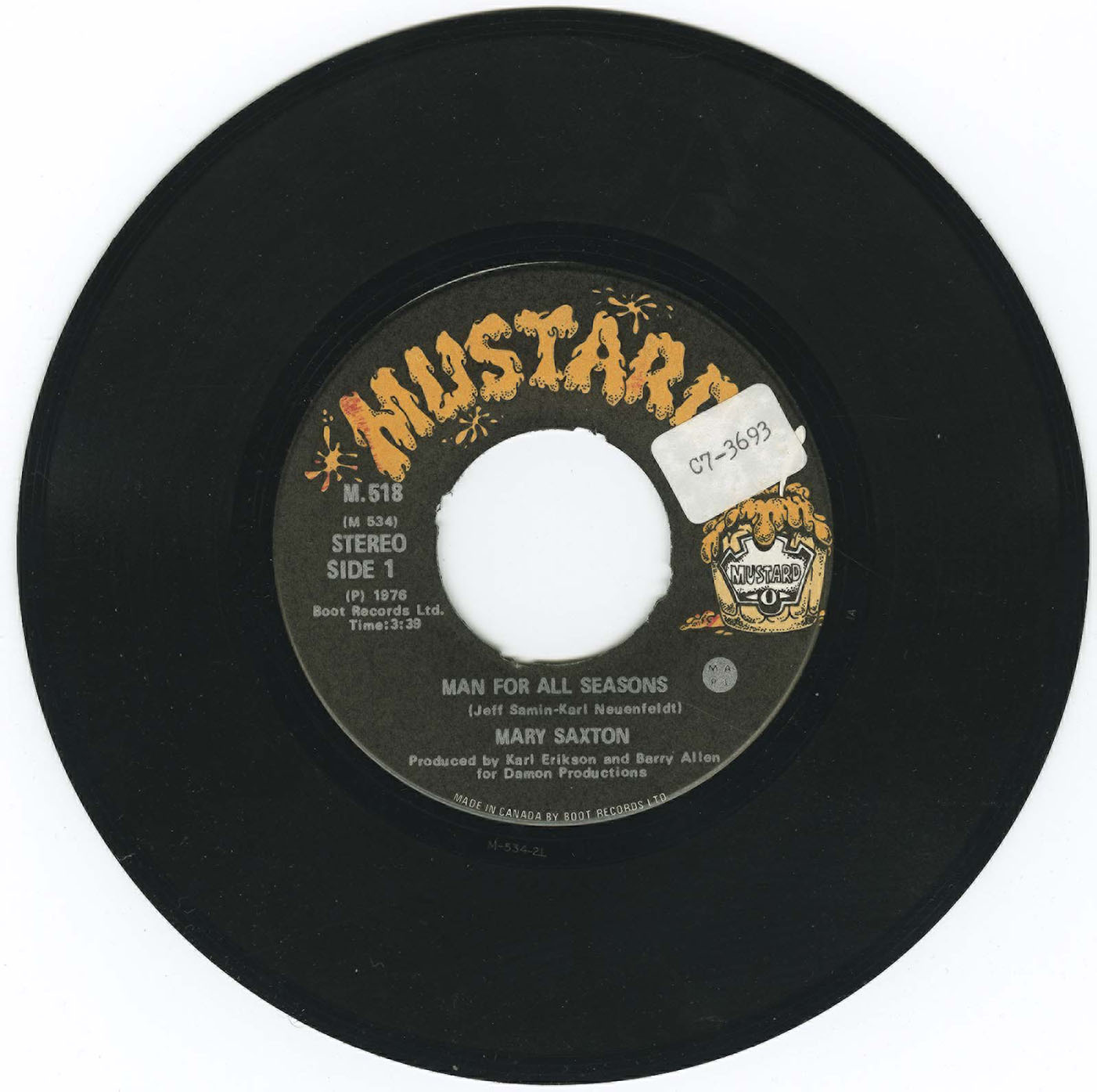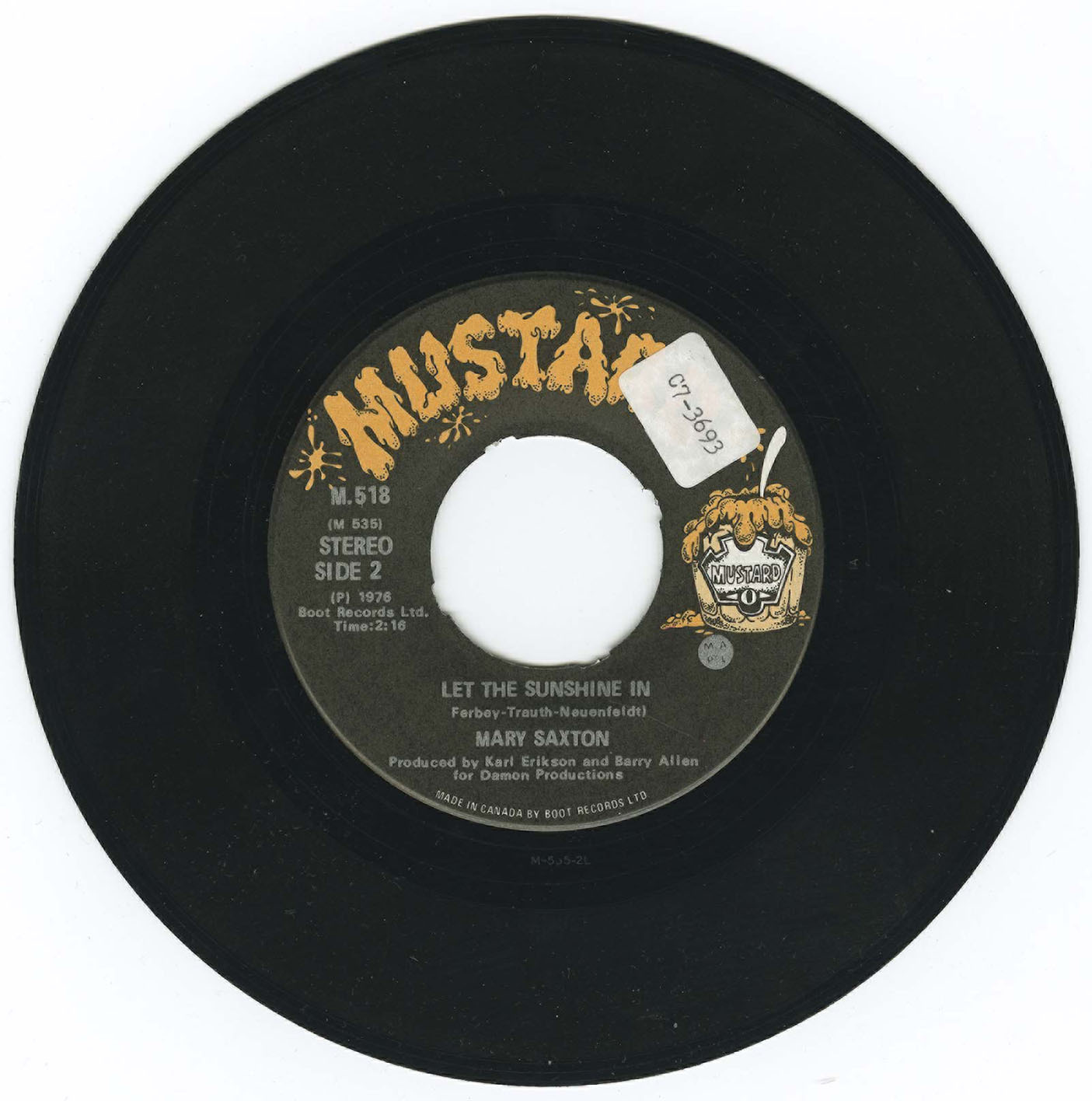 “One of the things about joy is that once you're lucky enough to feel it, you don't always succeed in expressing it for yourself or for others. But there's one girl — a dark-eyed entertainer of charm and warmth who does and can help you to do it too. Mary Saxton can make you feel good, simply because she is so obviously 'feelin' fine' and her songs will definitely please you. Mary has been singing professionally for many years in Western Canada, both on radio and television and has been active in album work as a back-up vocalist. Her talents as a songwriter come to light for the first time on this recording and with help from arranger Curt Watts, Mary shows you that music is her life. Please share it with her.”