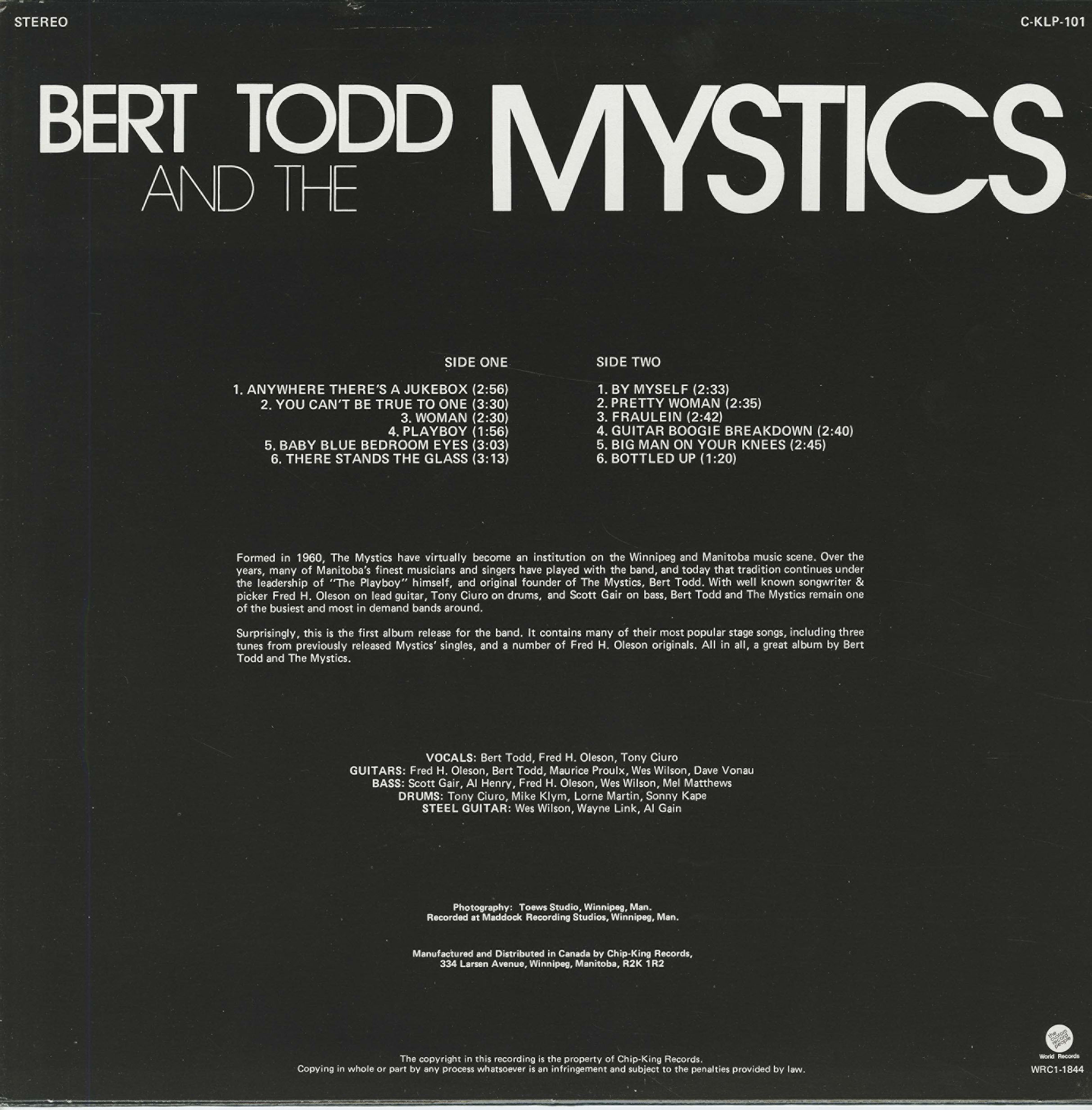 Surprisingly, this is the first album release for the band. It contains many of their most popular stage songs, including three tunes from previously released Mystics' singles, and a number of Fred H. Oleson originals. All in all, a great album by Bert Todd and The Mystics.
