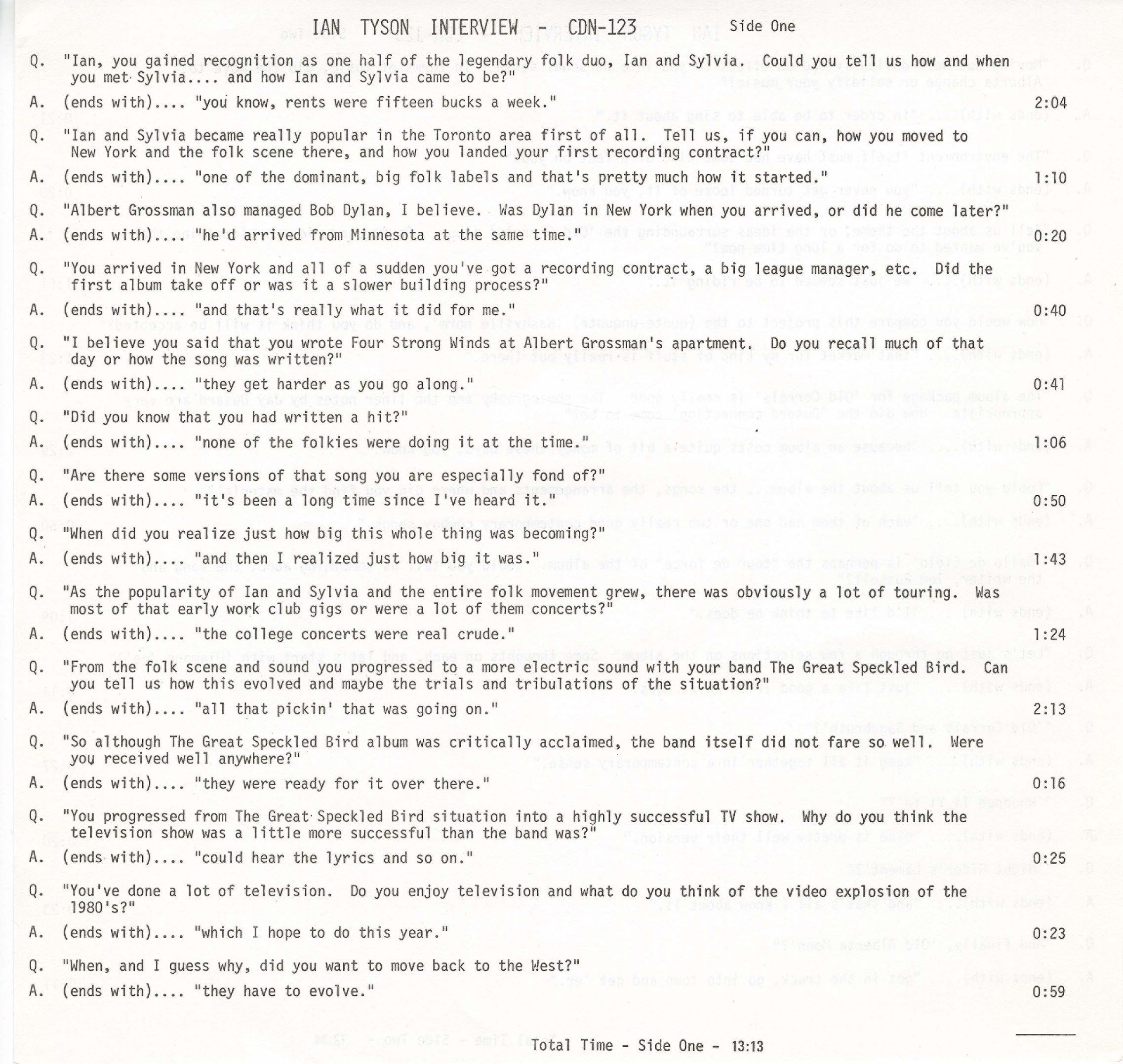 Ian Tyson - Interview INSERT CUE SHEET SIDE 01