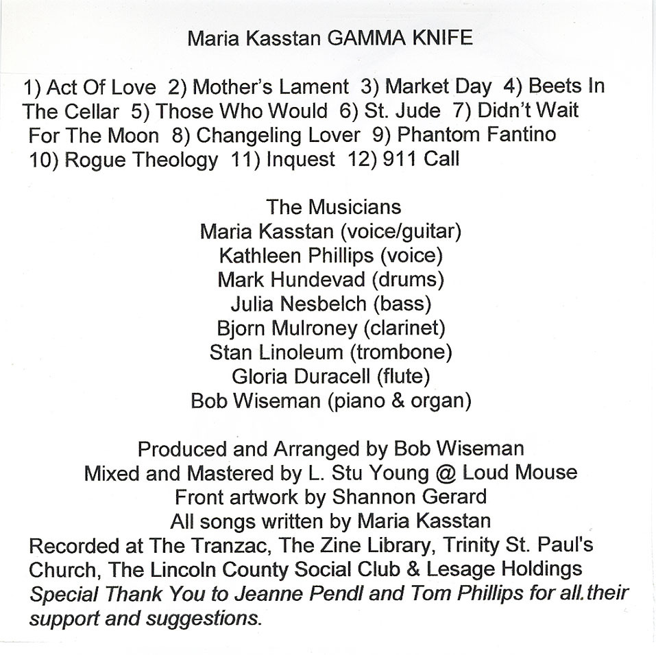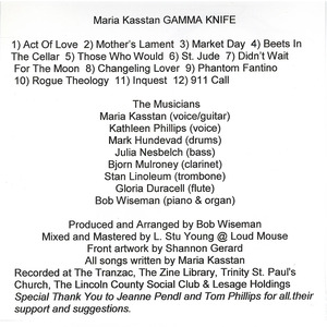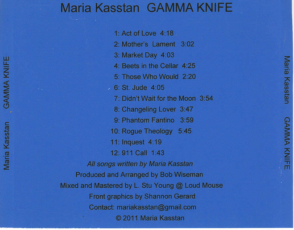 Activist, naturalist, feminist, Maria Kasstan, delivers a new kind of spiritual. Kasstan's GAMMA KNIFE tells a true love story set in Toronto. It is earthy, poetic, deeply personal and political; Traditional, folk, world and classical guitar weave enchanting melodies, while producer Bob Wiseman's arrangements color her deeply wise and fearless lyrics. These songs are a tribute to what was, a celebration of what could be, and a challenge to us all to stand up to the bullies, including those that now govern our country.
