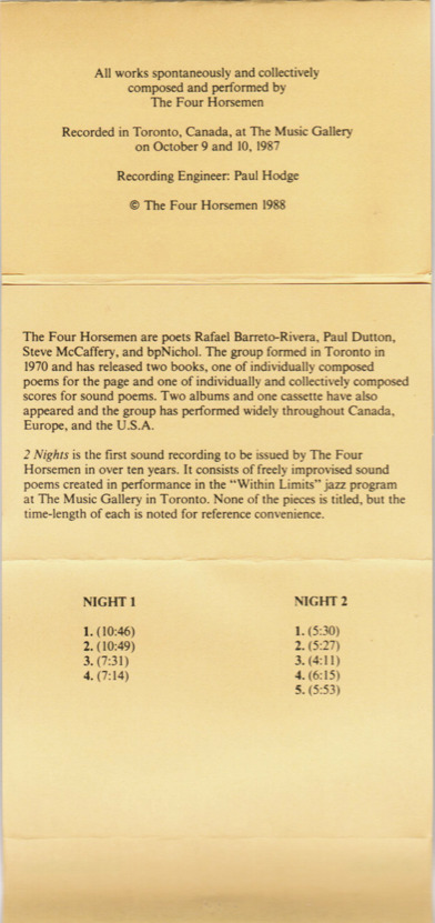 Recorded in Toronto, Ontario at The Music Gallery on October 9 & 10, 1987