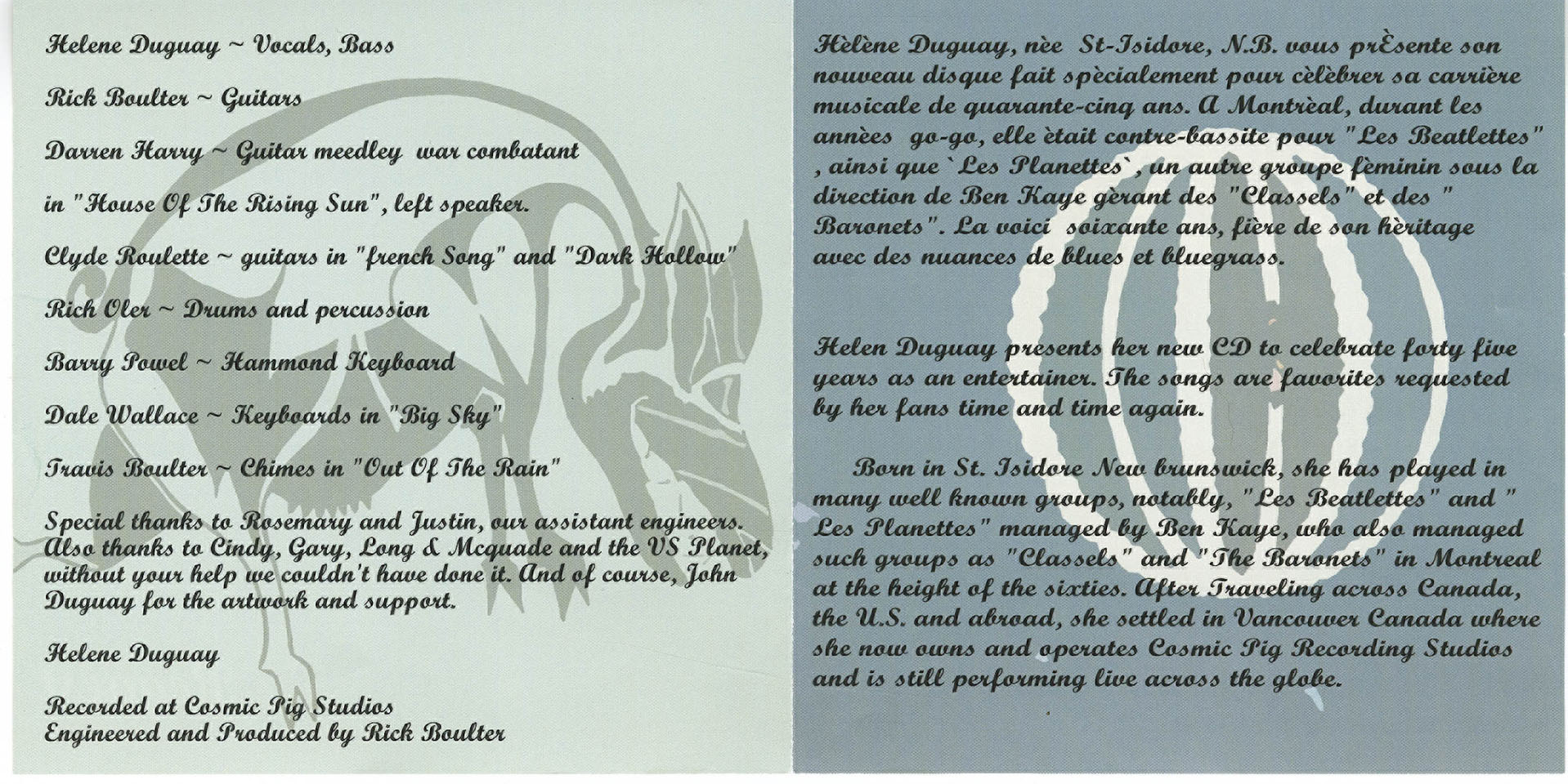 Born in St. Isidore, New Brunswick, she has played in may well known groups, notably "Les Beatlettes" and "Les Planettes" managed by Ben Kaye, who also managed such groups as "Classels" and "The Baronets" in Montreal at the height of the sixties. After travelling across Canada, the U.S., and abroad, she settled in Vancouver, British Columbia where she now owns and operated Cosmic Pig Recording Studios and is still performing live across the globe.