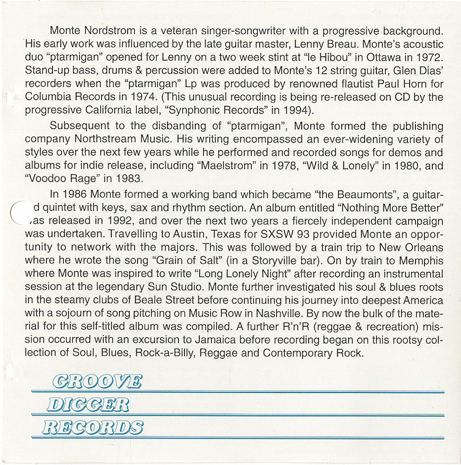 In 1986 Monte formed a working band which became 'The Beaumonts', a guitar-led quintet with keys, sax and rhythm section. An album entitled 'Nothing More Better' was released in 1992, and over the next two years a fiercely independent campaign was undertaken. Travelling to Austin, Texas for SXSW 93 provided monte an opportunity to network with the majors. This was followed by a train trip to New Orleans where he wrote the song 'Grain of Salt' (in a Storyville bar). On by train to Memphis where Monte was inspired to write 'Long Lonely Night' after recording an instrumental session at the legendary Sun Studio. Monte further investigated his soul & blues roots in the steamy clubs of Beale Street before continuing his journey into deepest America with a sojourn of song-pitching on Music Row in Nashville.