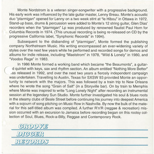 Monte Nordstrom is a veteran singer-songwriter with a progressive background. His early work was influenced by the late guitar master, Lenny Breau. Monte's acoustic duo, 'ptarmigan' opened for Lenny on a two week stint at 'le Hibou' in Ottawa in 1972. Stand-up bass, drums & percussion were added to Monte's 12 string guitar & Glen Dias' recorders when the 'ptarmigan' LP was produced by the renowned flautist, Paul Horn for Columbia Records in 1974. (This unusual recording was to be re-released on CD by the progressive California label 'Synphonic Records' in 1994).