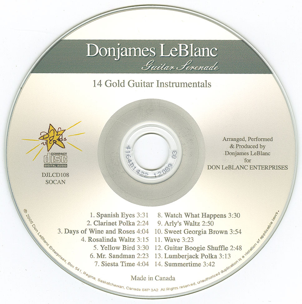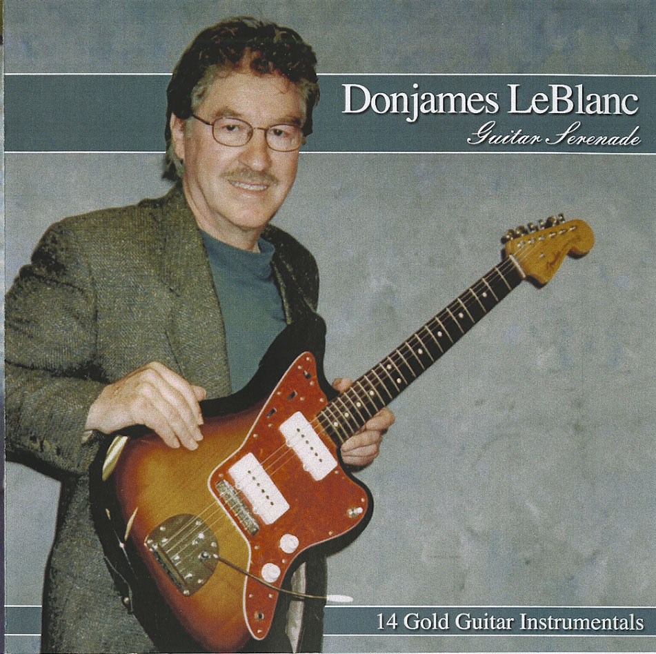GUITAR SERENADE released May 2005 by Donjames LeBlanc is a Compact Disc Album of 14 GOLD ‘classic’ Guitar Instrumentals. It was recorded on location at Donjames’ DJL digital recording studio. “Guitar Serenade” contains several lead-guitar stereo tracks plus several stereo rhythm-guitar tracks by Donjames, as well as stereo accompaniment tracks arranged, produced and played on music-sequencer instruments. This is a very ‘clean’ relaxing Compact Disc! You might even want to dance!