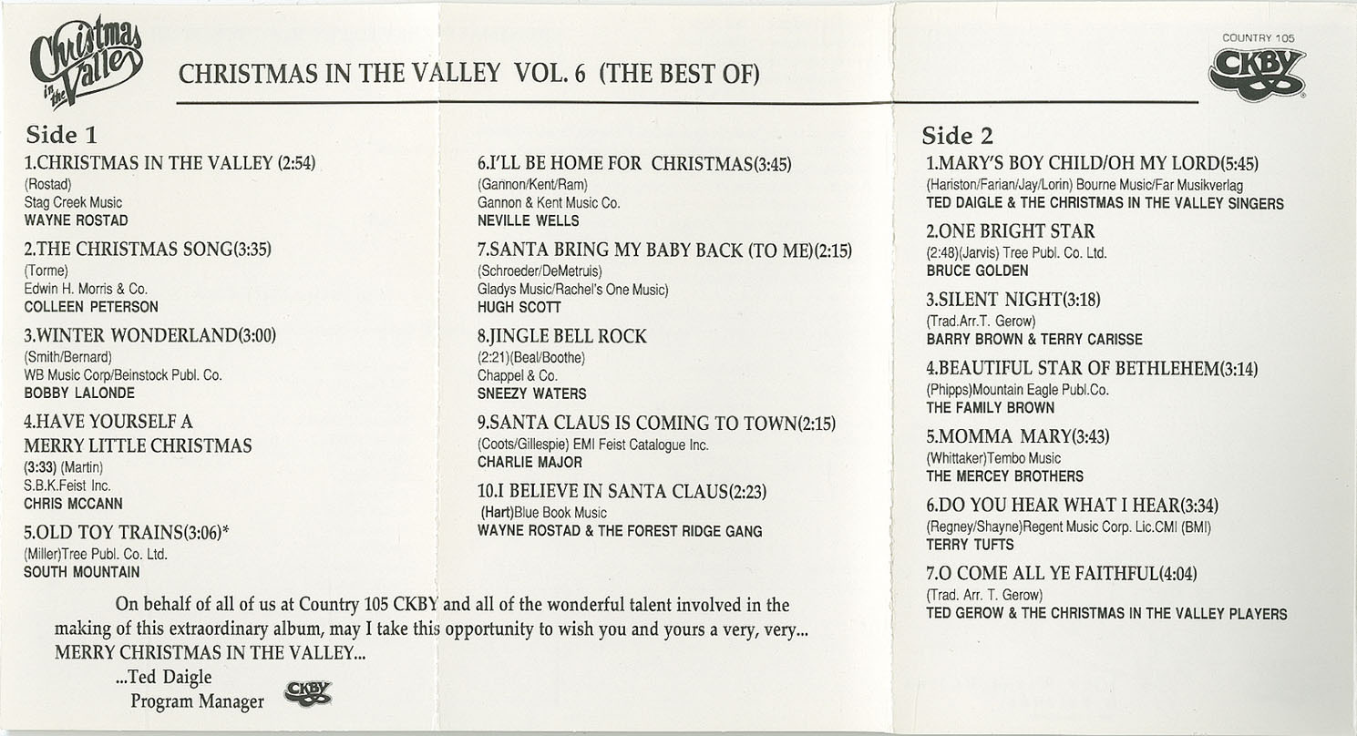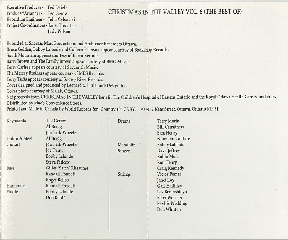 The song 'Christmas In The Valley', written by Wayne Rostad, has generated national airplay and has become a Yuletide standard; the song inspired a TV Special and a series of annual Christmas albums, with proceeds donated to the Children’s Hospital of Eastern Ontario (CHEO). Wayne has also contributed his talents to telethons on behalf of The Ottawa Heart Institute and various other charitable organizations. This collection is the final in the series - The Best Of.