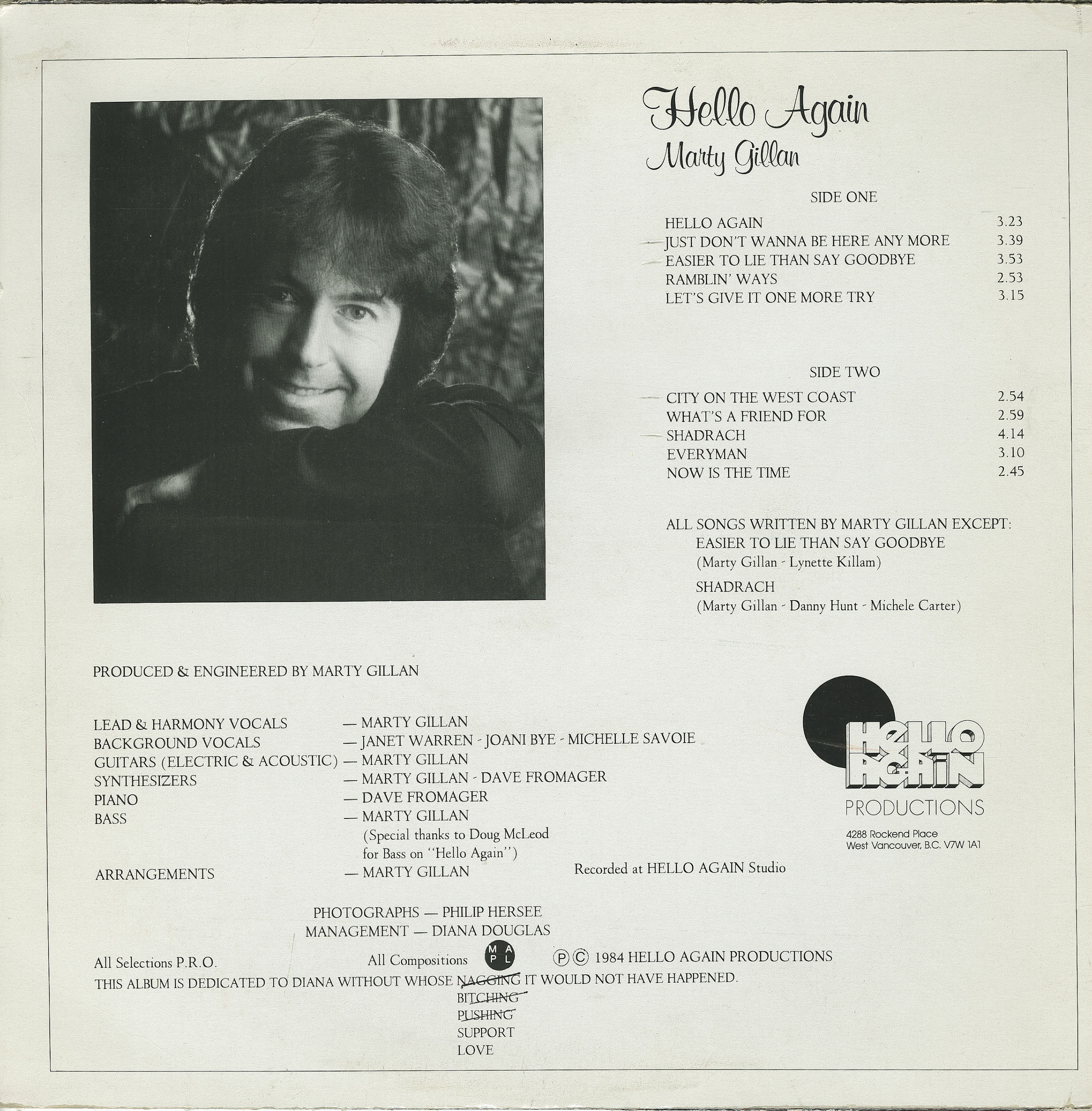 Written by Marty Gillan except 'Easier to Lie Than Say Goodbye' (Marty Gillan and Lynette Killam) and 'Shadrach' (Marty Gillan. Danny Hunt, and Michele Carter)