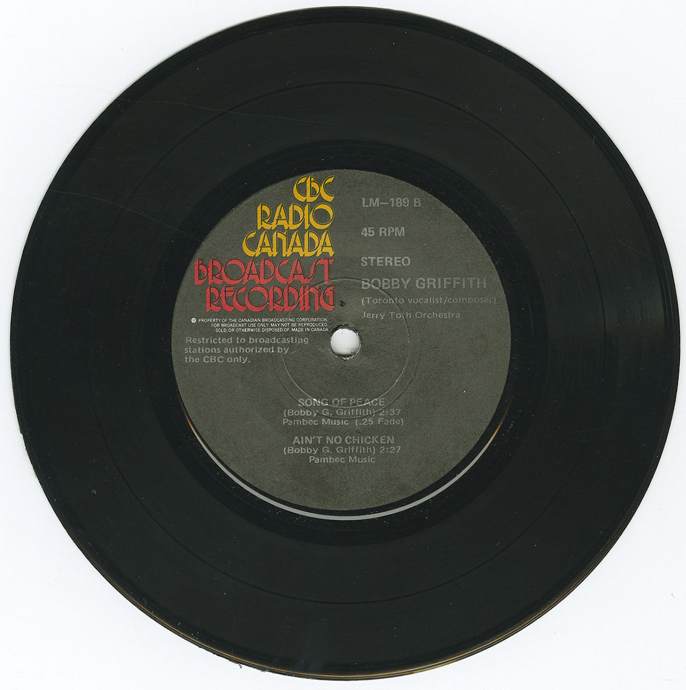 This phase was reinforced by his appearance on the CBC Radio Canada LM Series. The 1973 single Toronto Vocalist/Composer (LM 189) featured four Griffith originals — “My Love, My Love,” “Donna Is a Woman,” “Song of Peace,” and “Ain’t No Chicken” — backed by the Jerry Toth Orchestra, formally establishing him as both composer and vocalist within the jazz-pop and broadcast music tradition.