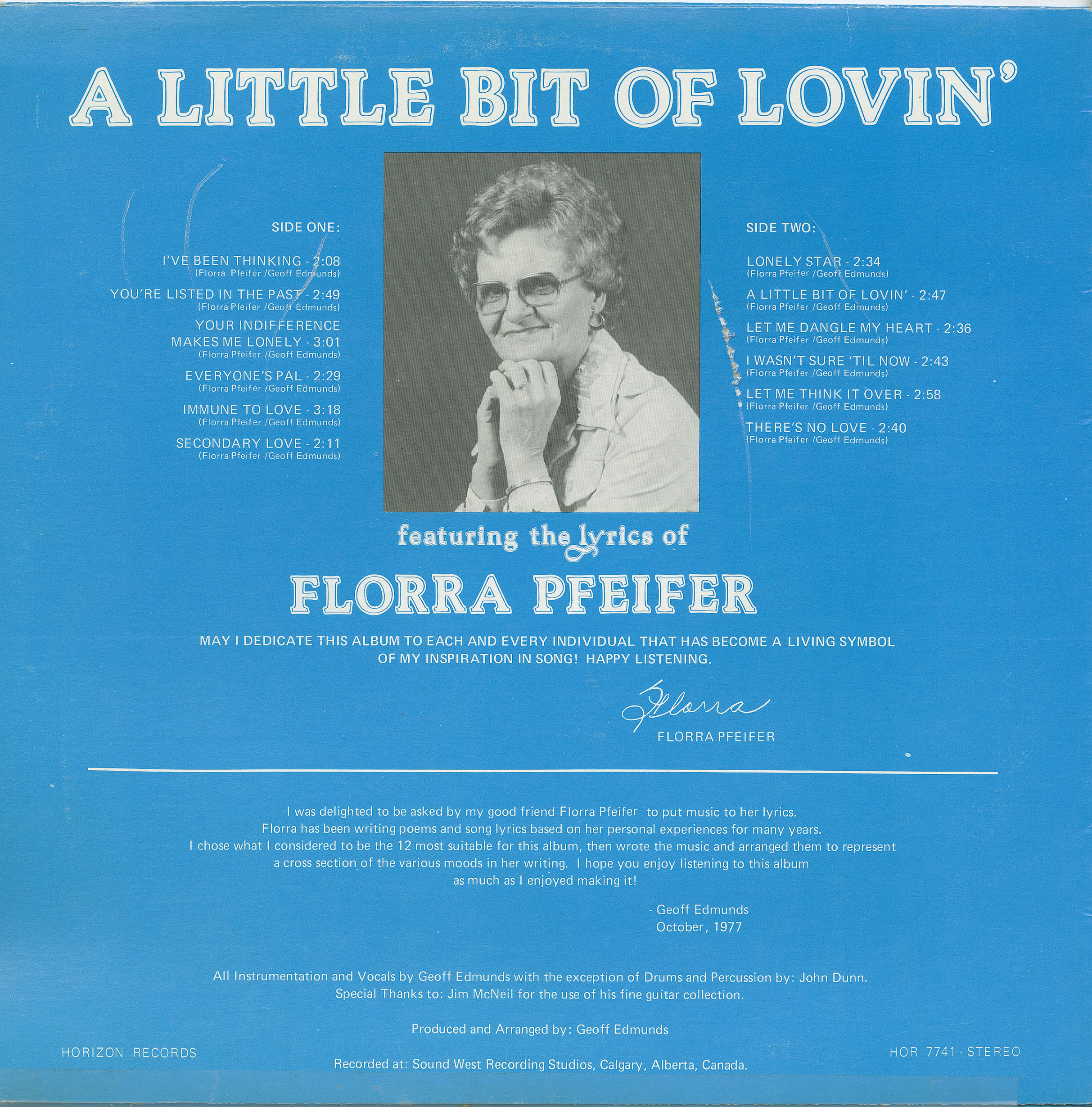 This is Geoff Edmunds first recording, an album of songs written by Calgarian Florra Pfeifer.