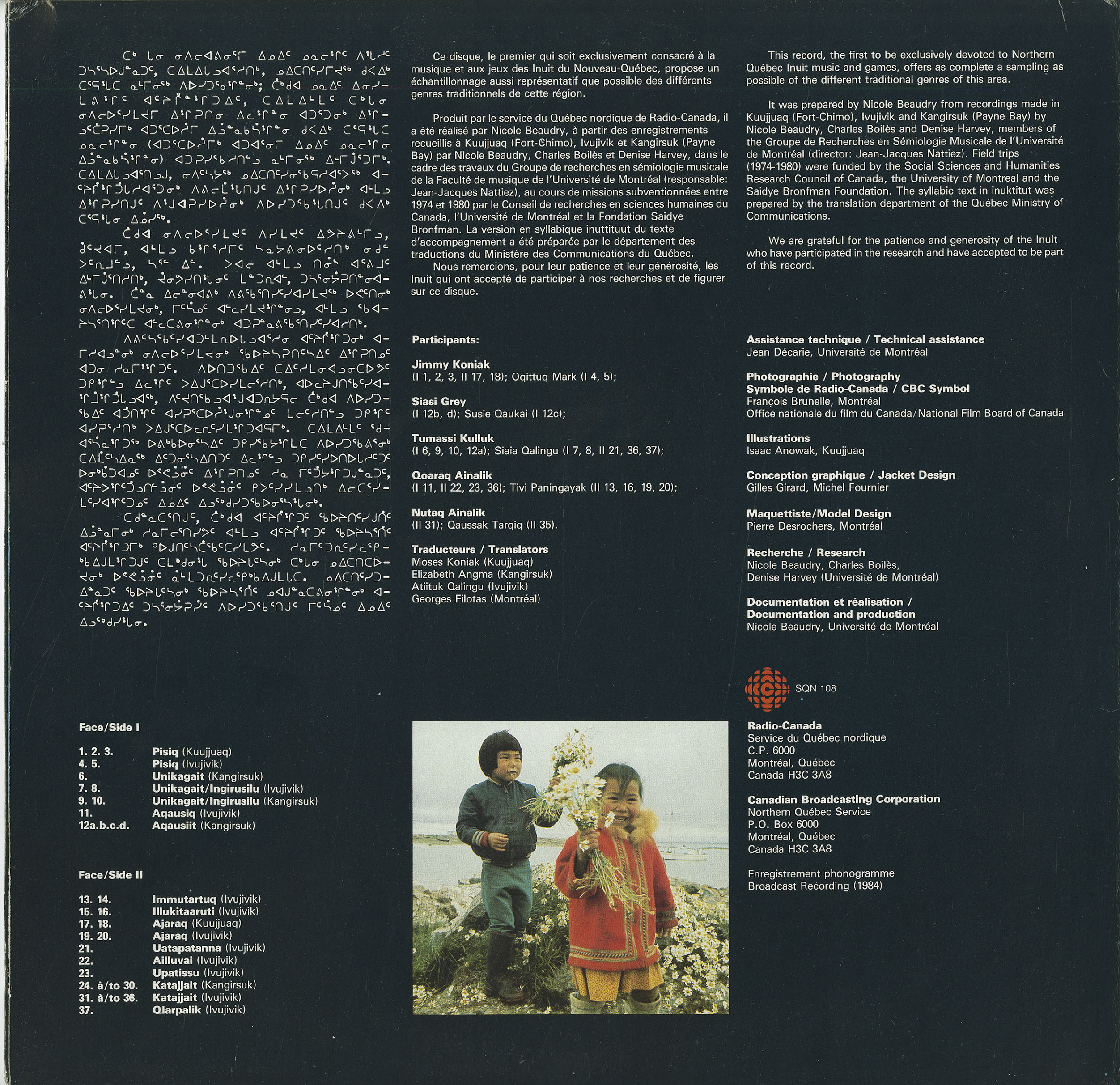 It was prepared by Nicole Beaudry from recordings made in Kuujjuaq (Fort-Chimo), Ivujivik and Kangirsuk (Payne Bay) by Nicole Beaudry, Charles Boiles and Denise Harvey, members of the Groupe de Recherches en Semiologie Musicale de I'Universite de Montreal (director: Jean-Jacques Nattiez). Field trips (1974-1980) were funded by the Social Sciences and Humanities Research Council of Canada, the University of Montreal and the Saidye Bronfman Foundation. The syllable text in inuktitutwas prepared by the translation department of the Quebec Ministry of Communications.