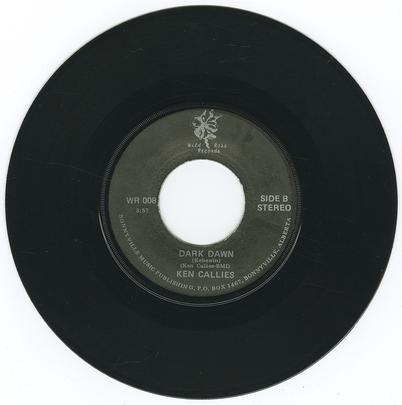 In the early 70s, Ken Callie found success in the country music scene with his hit 'Wild Rose', released on Wild Rose Records WR 008, featuring 'Dark Dawn' on side 2. Ken recalls: "the lyric in wild rose "lookin at the bluesky on the dollar" is a town that was pictured on the old Canadian one dollar bill at the time. it was in bluesky where I first met Rose a very pretty native girl. She wasnt really wild, I just added that for the song. The lyrics "why do women do the things they do like goin out and gettin a tattoo" was written at the time when i had just split with my steady and next time I saw her she had some guys name largely tattooed on her leg. I guess that's the vengence part. The next lyrics "he was just a drummer from L.A. his rose came and took him away" our drummer at the time was from L.A. and girlfriend did come up to where we were and convinced him to quit the band and go home to L.A. The lyrics "if you have a thorn you must remove it" came from the bible. I was stuck for the next line so I randomly opened the bible and pointed to a line. It said "if thy right offened thee cut it off, if thy right eye offened thee pluck it out", I took it to mean if somethings bothering you get rid of it."