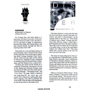 for Corsage fans, this latest album is a must-have; for those of you new to the monumental Vancouver band, I envy the discovery you are about to make. A collaboration between Phil Smith, Bill Napier-Hemy, and their talented friends, Corsage has been an ongoing project since 1981.