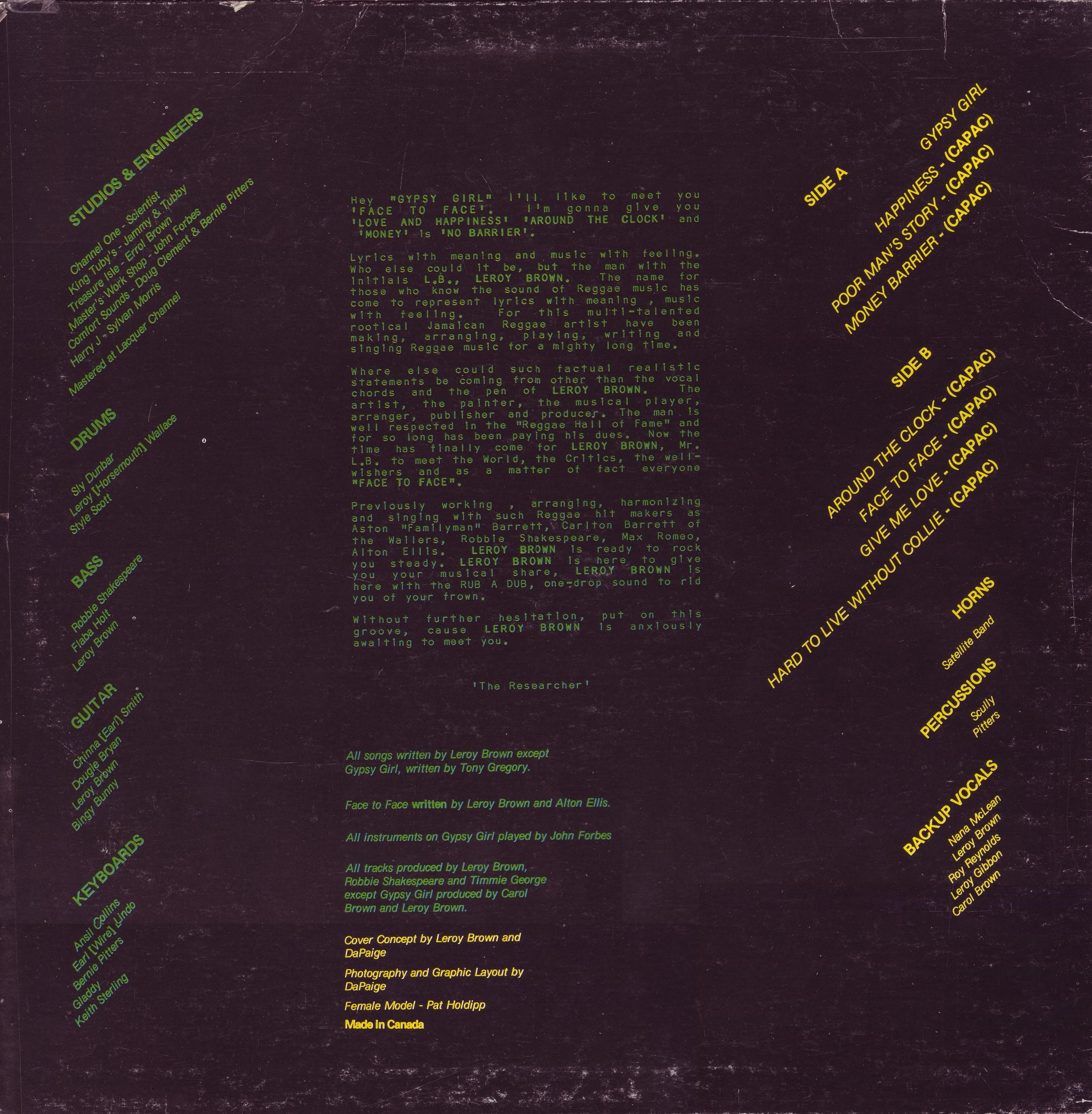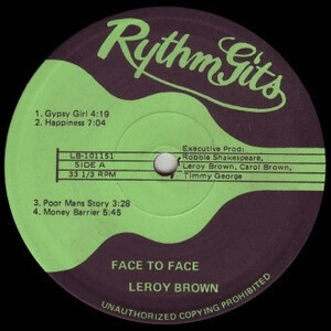 All songs written by Leroy Brown except 'Gypsy Girl' by Tony Gregory; and 'Face to Face by Leroy Brown and Alton Ellis