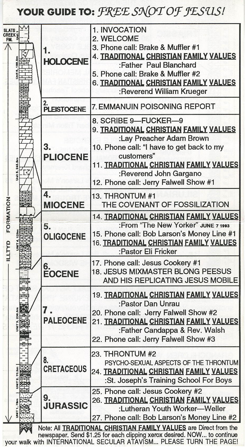 Triassic: The Poetry of International Secular Atavism - Traditional Family Values: Reverend Virgil Carpenter - Phone Call: Jesus Cookery #3 - Scribble Double Tubby - Phone Call: Jesus Cookery #4