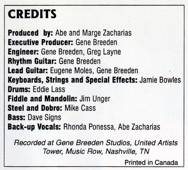 Recorded at Gene Breeden Studios, United Artists Tower, Music Row, Nashville, Tennessee, USA