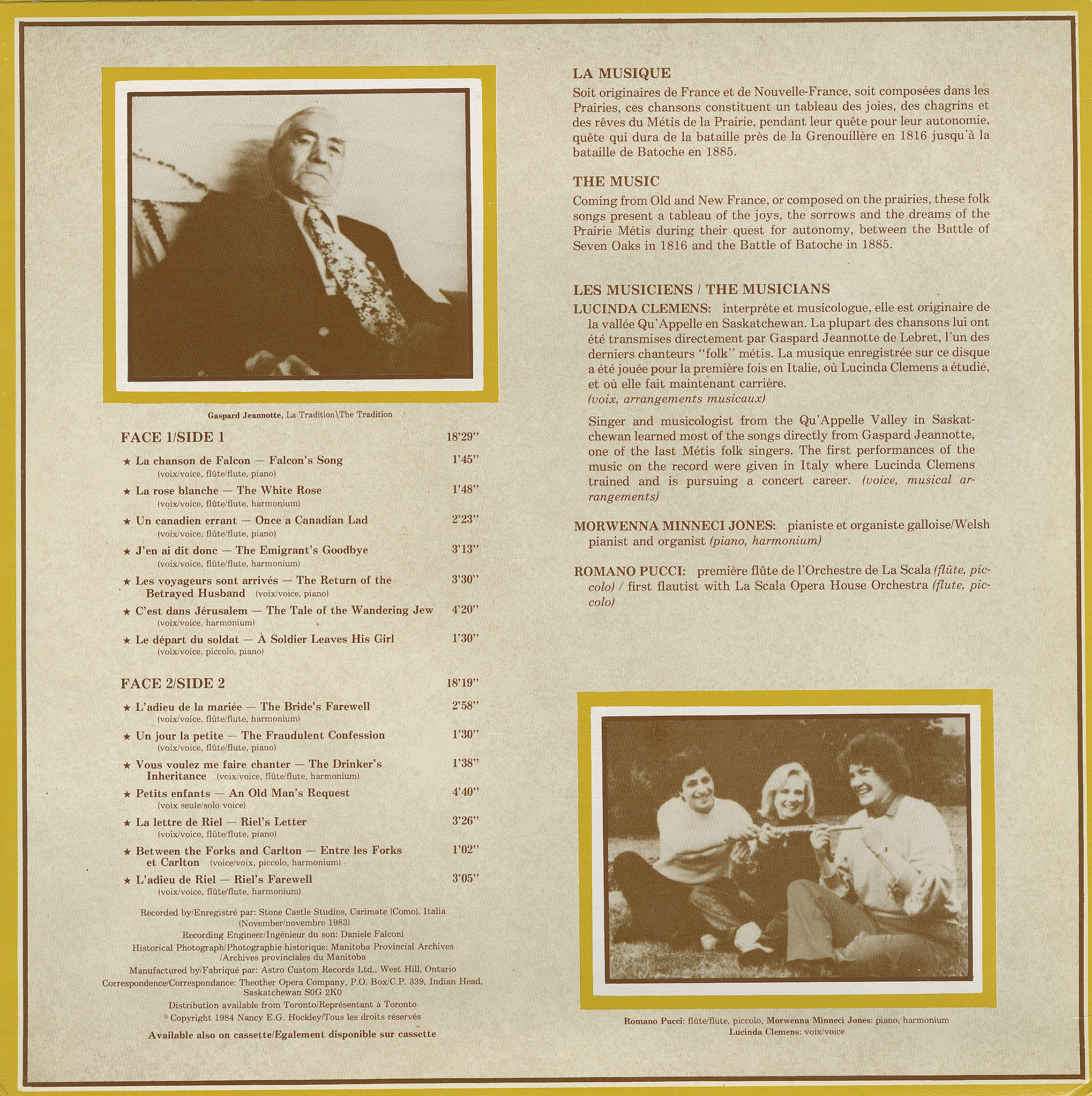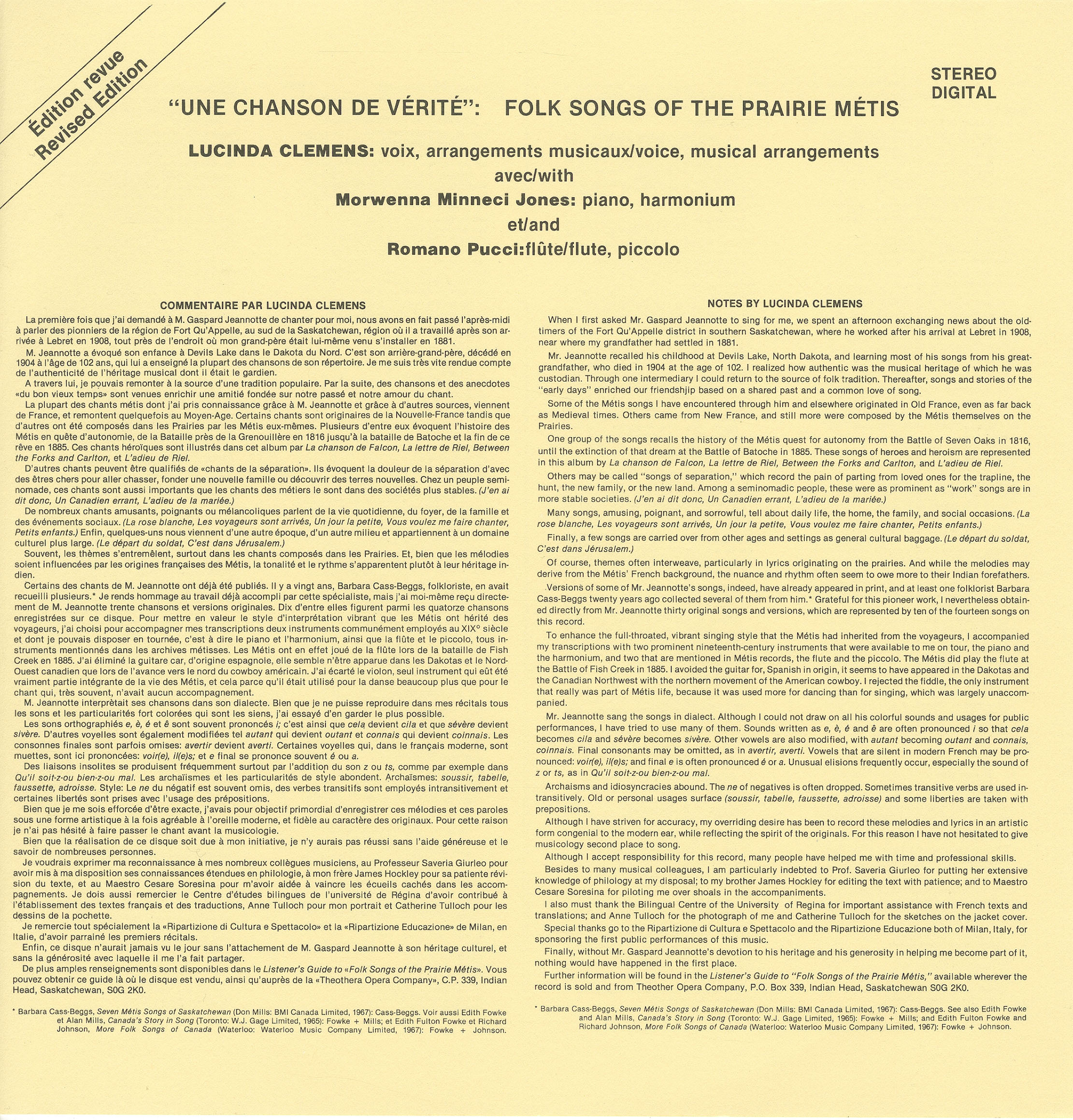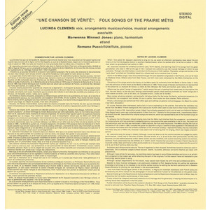 Lucinda Clemens is a singer and musicologist from the Qu'Appelle Valley in Saskatchewan. She learned most of the songs directly from Gaspard Jeannotte, one of the last Metis folk singers. The first performances of the music on the record were given in Italy where Lucinda Clemens trained and is pursuing a concert career.