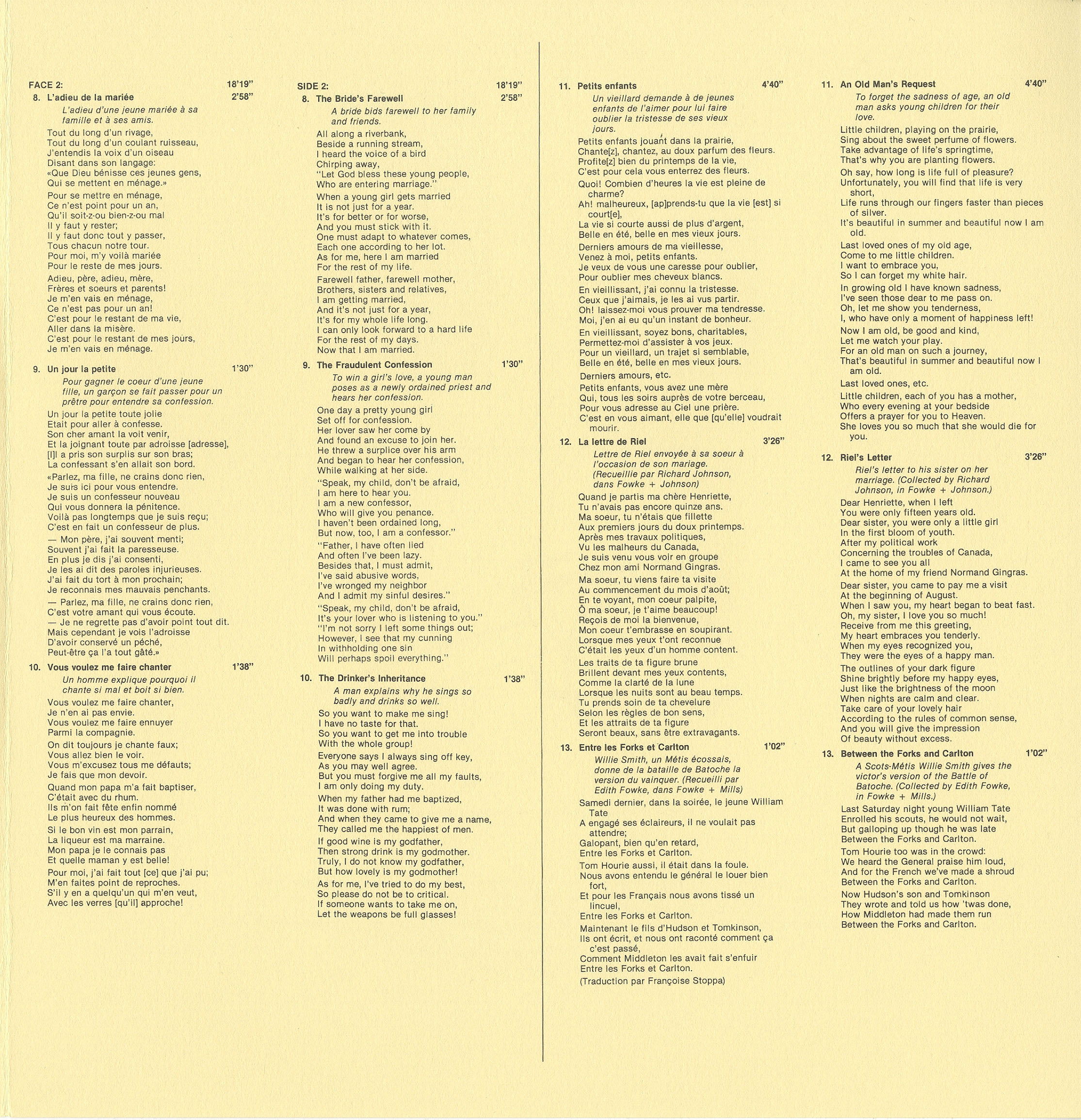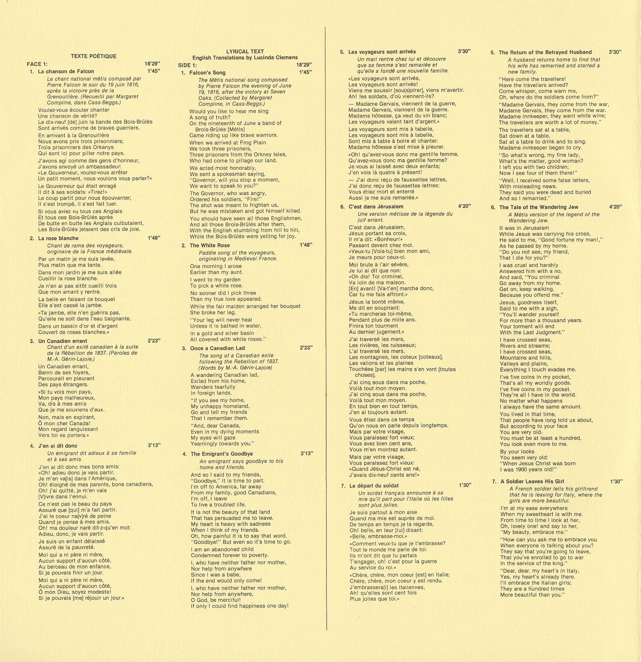 Coming from Old and New France, or composed on the Prairies, these folk songs present a tableau of the joys, the sorrows, and the dreams of the Prairie Métis during their quest for autonomy between the Battle of Seven Oaks in 1816 and the Battle of Batoche in 1885.