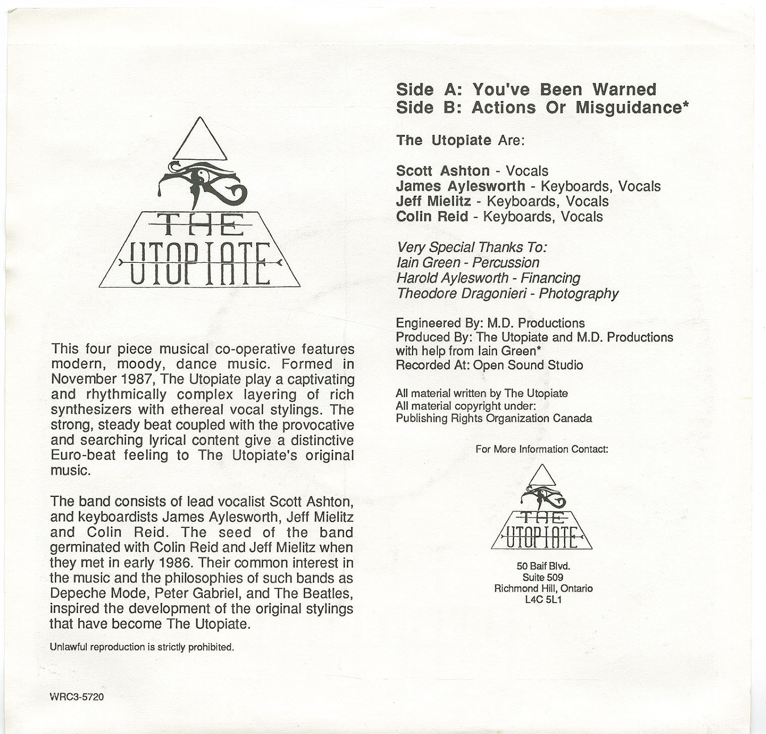 The Utopiate's lone 7-inch single, You’ve Been Warned b/w Actions or Misguidance, released in 1987, showcases a snapshot of late-80s Canadian synth-pop. Hailing from Richmond Hill, Ontario, the four-piece band combined an energetic, danceable A-side with a darker, introspective B-side. Both tracks highlight their appreciation for synth-driven music, drawing comparisons to acts like Depeche Mode, yet retaining their own charm.