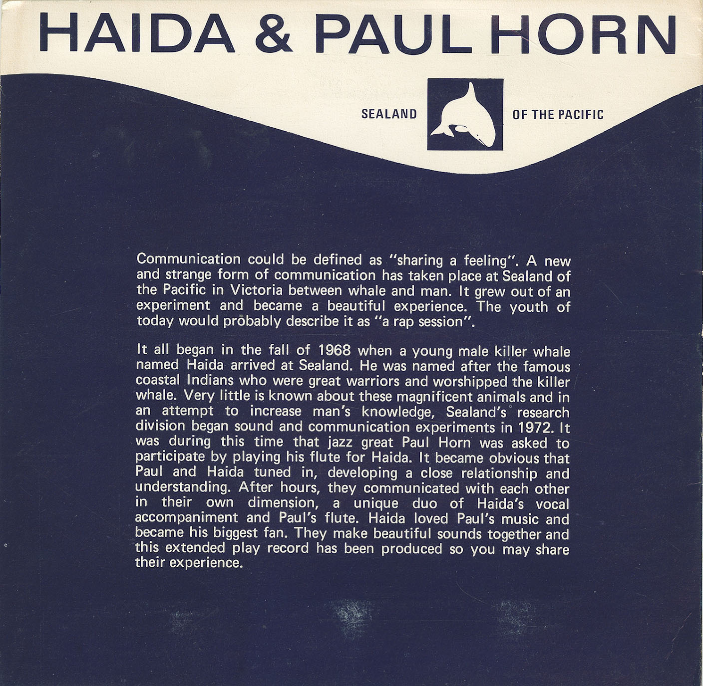 By 1972, Sealand had begun conducting sound and communication experiments with Haida. As part of these studies, Paul Horn, an acclaimed jazz flutist known for his explorations in ambient and world music, was invited to perform for Haida.