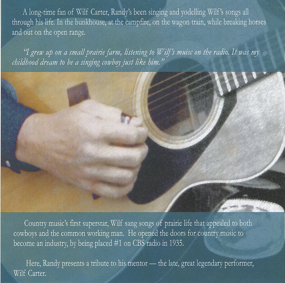 A long-time fan of Wilf Carter, Randy’s been singing and yodelling Wilf’s songs all through his life. In the bunkhouse, at the campfire, on the wagon train, while breaking horses and out on the open range.