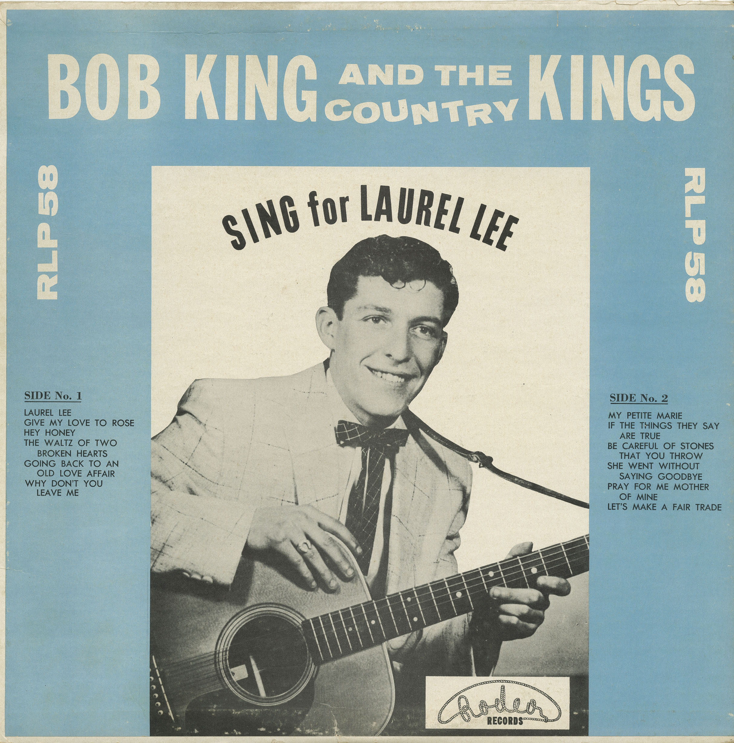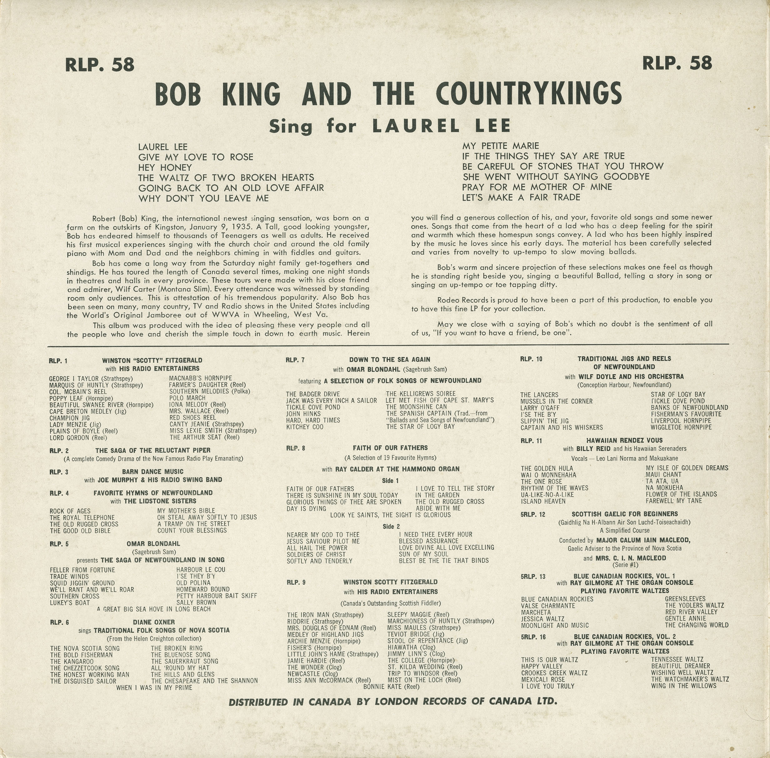 Robert (Bob) King, the international newest singing sensation, was born on a farm on the outskirts of Kingston, January 9, 1935. A tall, good looking young man, Bob has entertained himself to thousands of Teenagers as well as adults. He received his first musical success in singing with the church choir and the aid of his family piano. Bob has come a long way from the Saturday night family get-togethers and is singing the songs that he heard and Crooners were singing over the radio stations in the thirties. He writes some of the lyrics, selects the songs, and with his band, the CountryKings, arranges them. This Ottawa-born boy has made appearances on radio and early tv alike. This is a distillation of Bob’s tremendous popularity. Also Bob’s modern style, understanding interpretation and fine voice, have united many traditional elements of music with the modern ideas.
