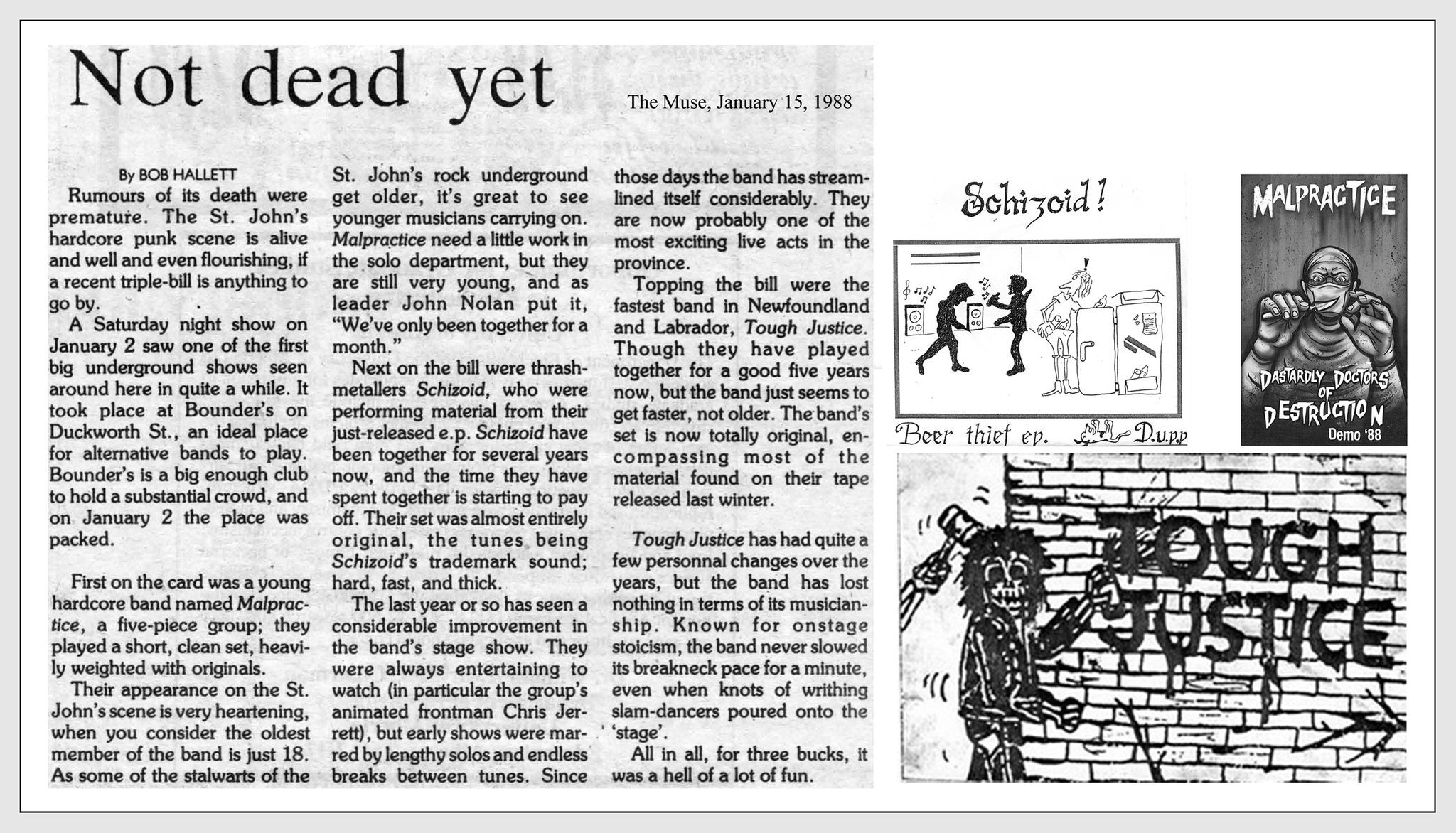 Tough Justice embodied the spirit of D.I.Y. Newfoundland hardcore when it was still carving out its own battered, bloodied niche. Formed in 1983 by Rod and Dean Locke, Danny Thomas, and Sean Doran, they first hit the stage at a MacPherson Jr. High talent show, hammering out reworded Sex Pistols covers to appease skeptical teachers. But by the time guitarist Johnny Fisher joined in late 1984, the band was already steering away from UK punk and colliding headfirst into the influence of American and Canadian hardcore.
