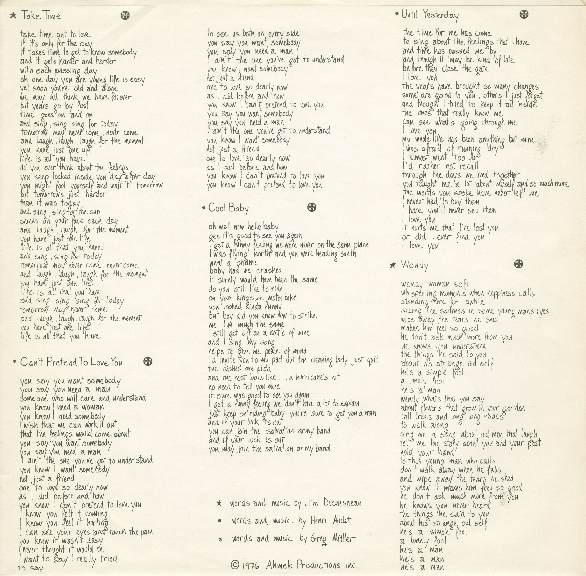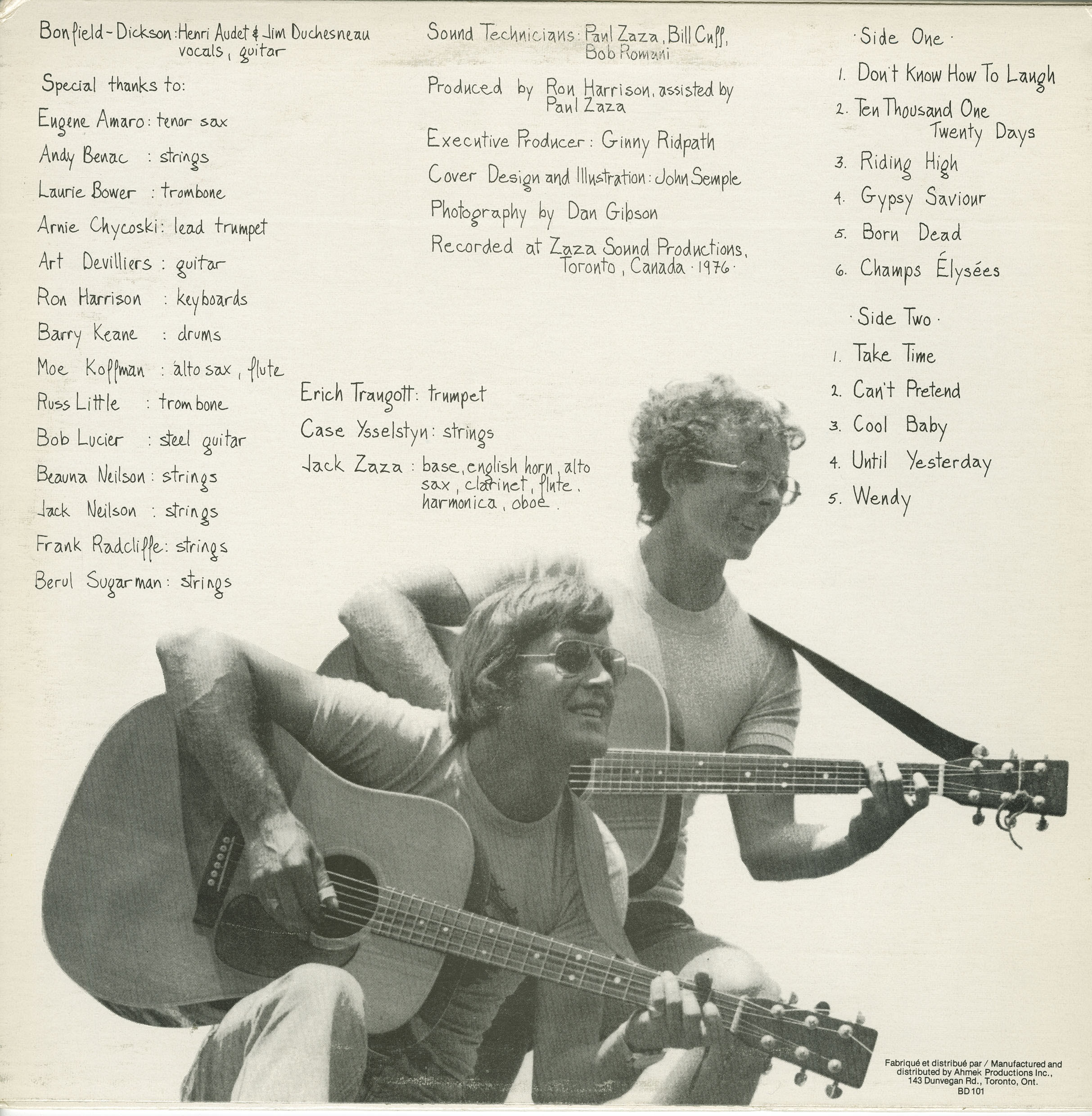 Recorded at Zaza Sound Productions, Toronto, Ontario, 1976