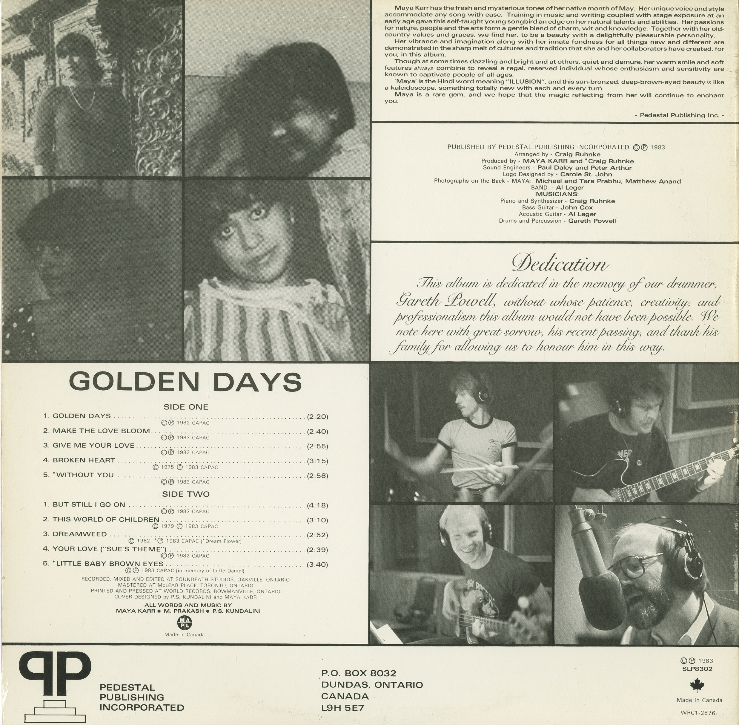 Photographs (back cover) of Maya Karr (Michael and Tara Prabhu and Matthew Anand); and of the Band (Al Leger)