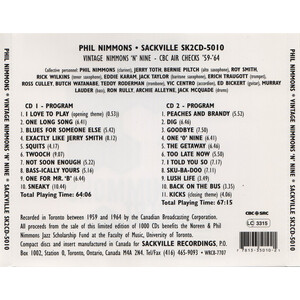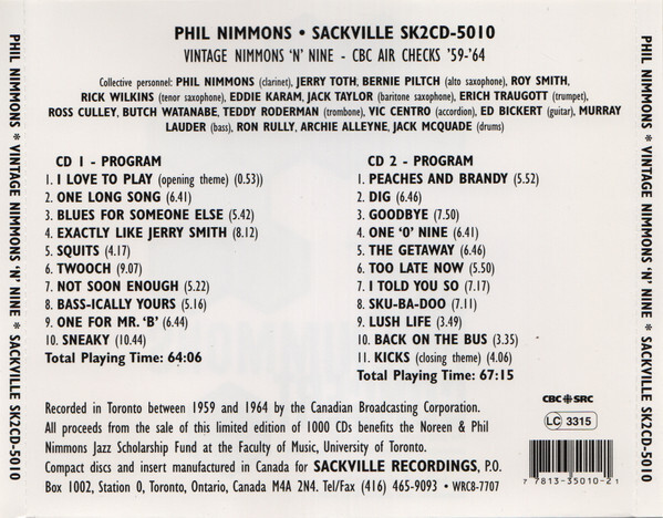 All proceeds from the sale of this limited edition of 1000 CDs benefits the Noreen & Phil Nimmons Jazz Scholarship at the Faculty of Music, University of Toronto.
