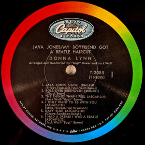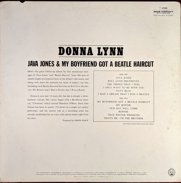Here’s the great follow-up album by that sensational teenager of “Java Jones” and “Beatle Haircut” fame. Her pair of smash singles are featured here as the album’s title tunes, and along with them she presents ten more of today’s top hits, including such Beatle-flavored favorites as Roll Over Beethoven, My Bonnie and I Had a Dream that I Was a Beatle.