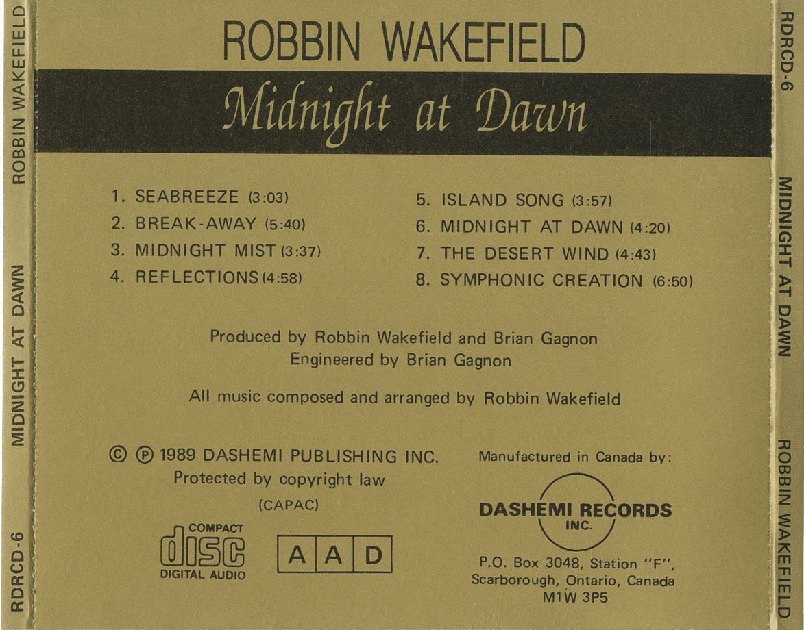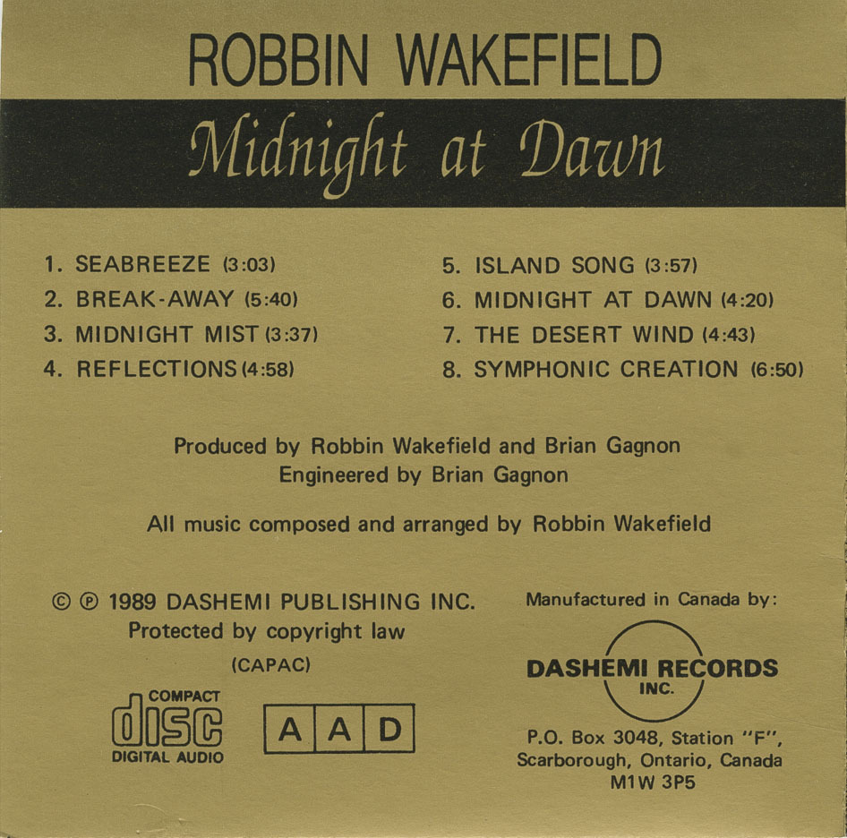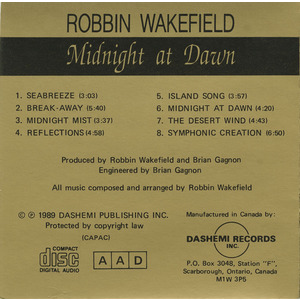 Robbin Wakefield is a Canadian guitarist, composer, and producer based in Toronto, Ontario. Emerging in the late 1980s, Wakefield released his debut instrumental album Midnight at Dawn in 1989 on Dashemi Records. The album showcased his skills as a multi-instrumentalist and arranger, blending smooth jazz, ambient textures, and melodic guitar work. At just 21 years old, Wakefield handled most of the instrumentation himself, collaborating with local musicians including Brian Gagnon and John Woodcock. In 1991, he followed up with A Lightfoot Collection, an instrumental tribute to Gordon Lightfoot, further cementing his reputation as a thoughtful interpreter and craftsman of Canadian melodies. Though details about his later career remain limited, Wakefield's early recordings reflect a refined musical vision rooted in composition and atmosphere.
