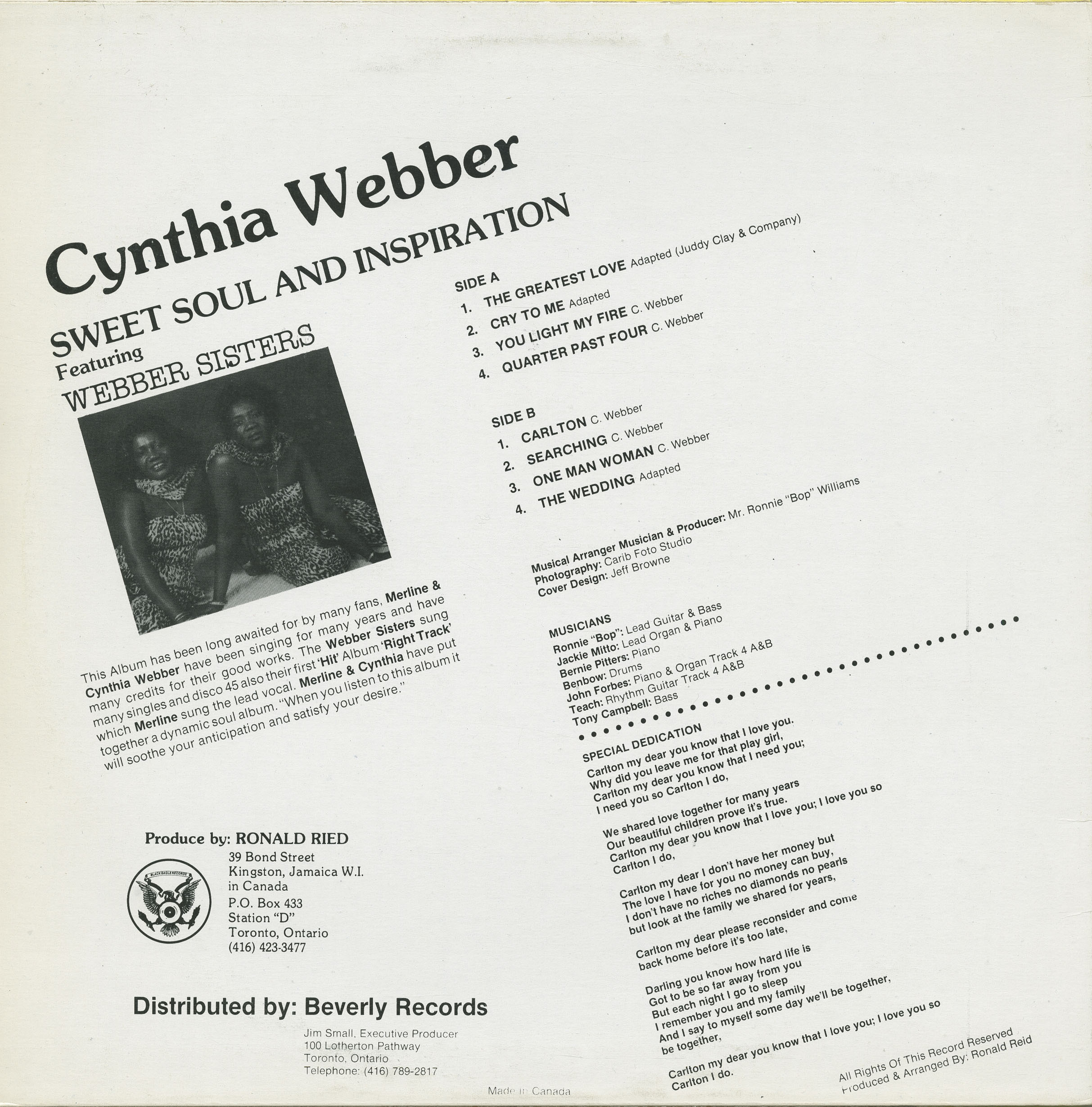 In 1969, Cynthia emigrated to Toronto, Canada, where she balanced her devotion to family and a long career in nursing with an enduring passion for music. Settling in Toronto’s Caribbean diaspora, she remained active creatively, founding Black Eagle Records to release both archival and new recordings by the Webber Sisters. She continued to perform and record, including a notable gospel-tinged solo LP Sweet Soul and Inspiration—featuring her sister—produced by Ronald Ried and the noted Jamaican guitarist and arranger Ronnie “Bop” Williams, with Jackie Mittoo contributing on keyboards.